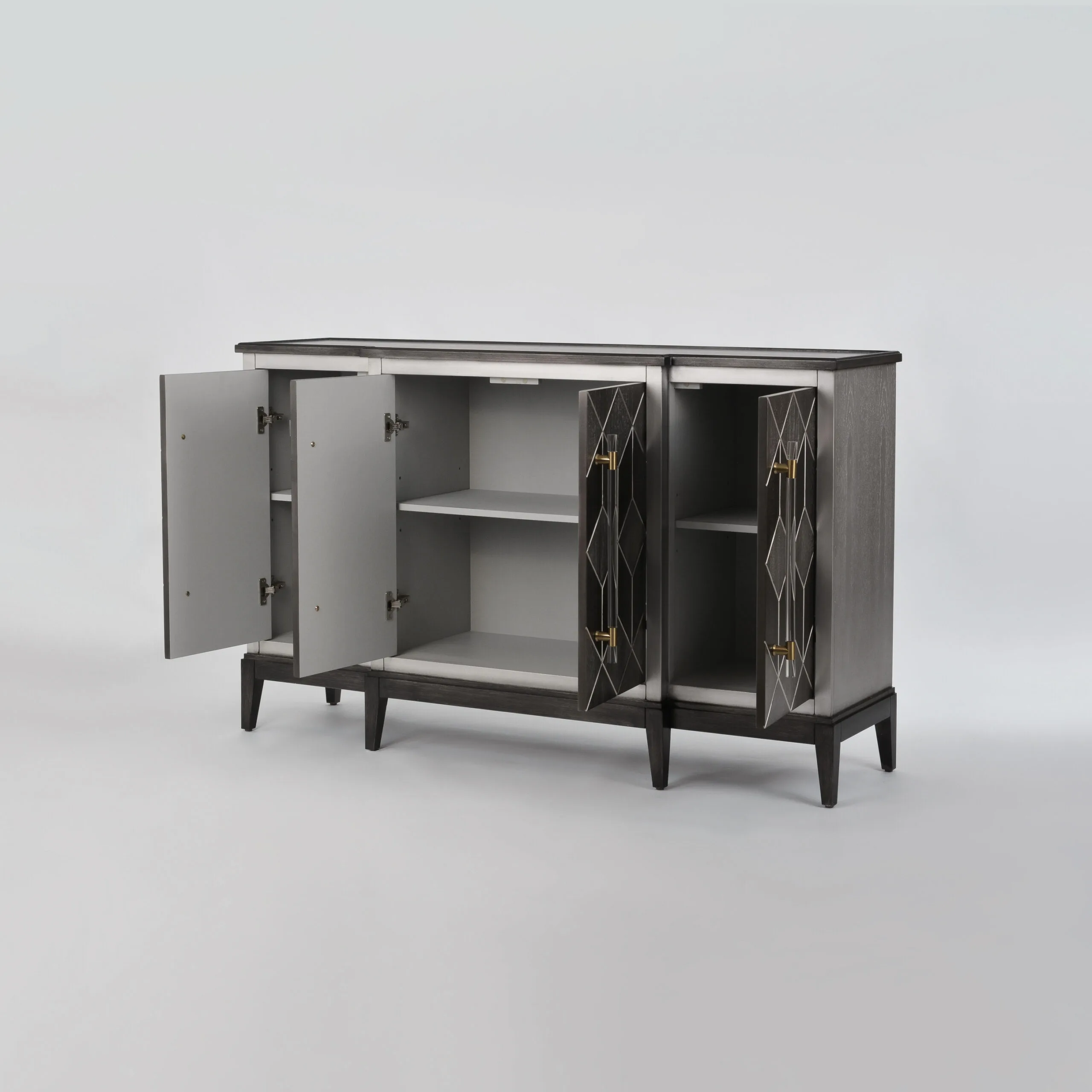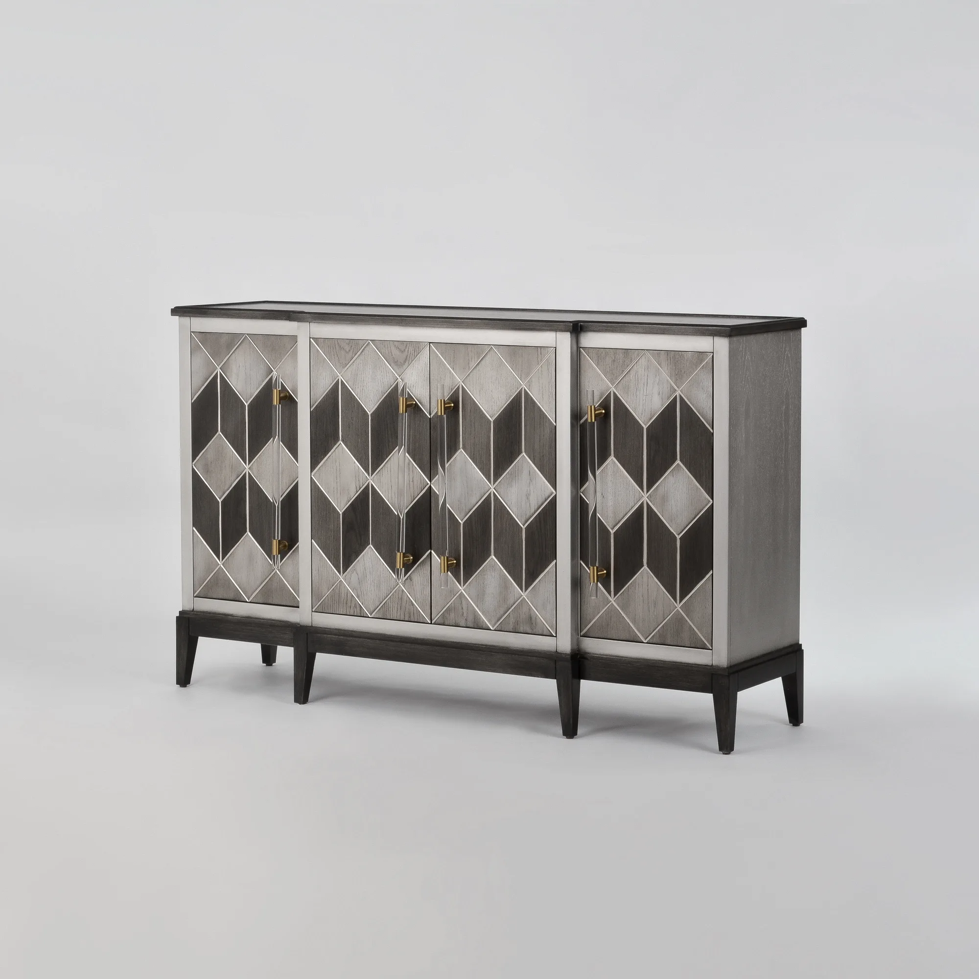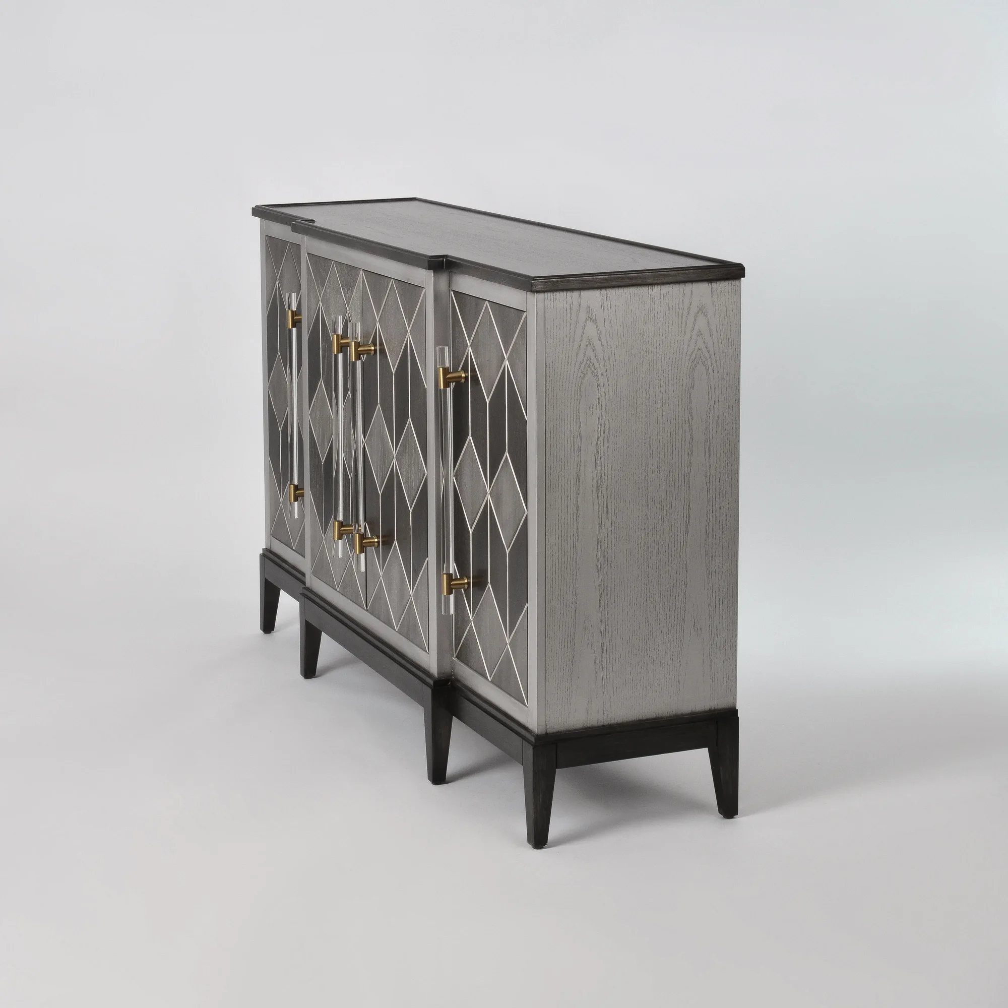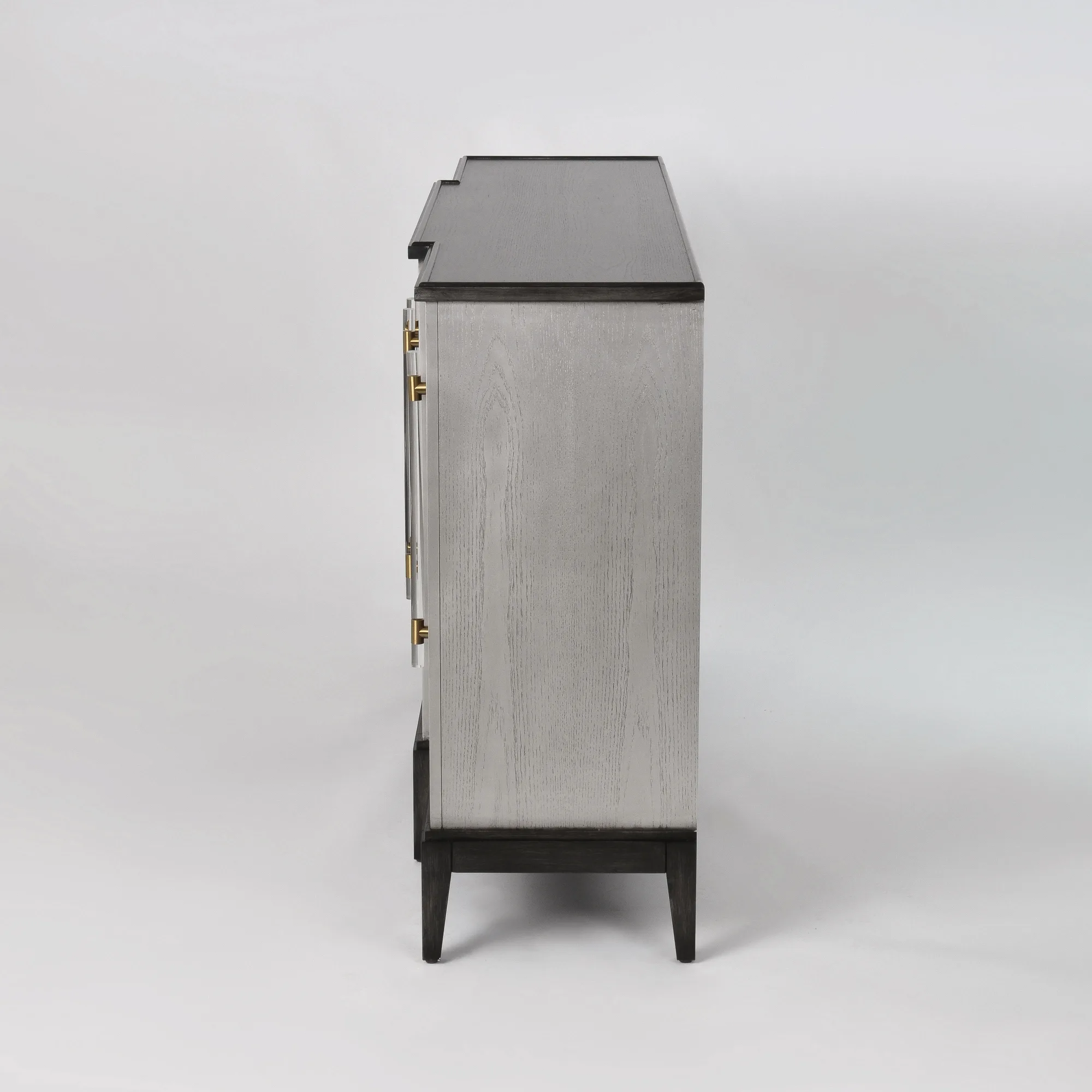 Stilig ST504 kummut elutuppa. See originaalne hall kummut lisab teie elutuppa stiili ja praktilisust. Kummuti esiküljel olev inkrusteering loob 3D-efekti, mida rõhutavad hõbedased jooned. Korpuse pind on kaetud tammespooniga, millel on nähtav puidustruktuur, lisades loomulikkust ja soojust. Akrüülist sirged käepidemed kuldsete metallist aktsentidega annavad elegantse viimistluse.