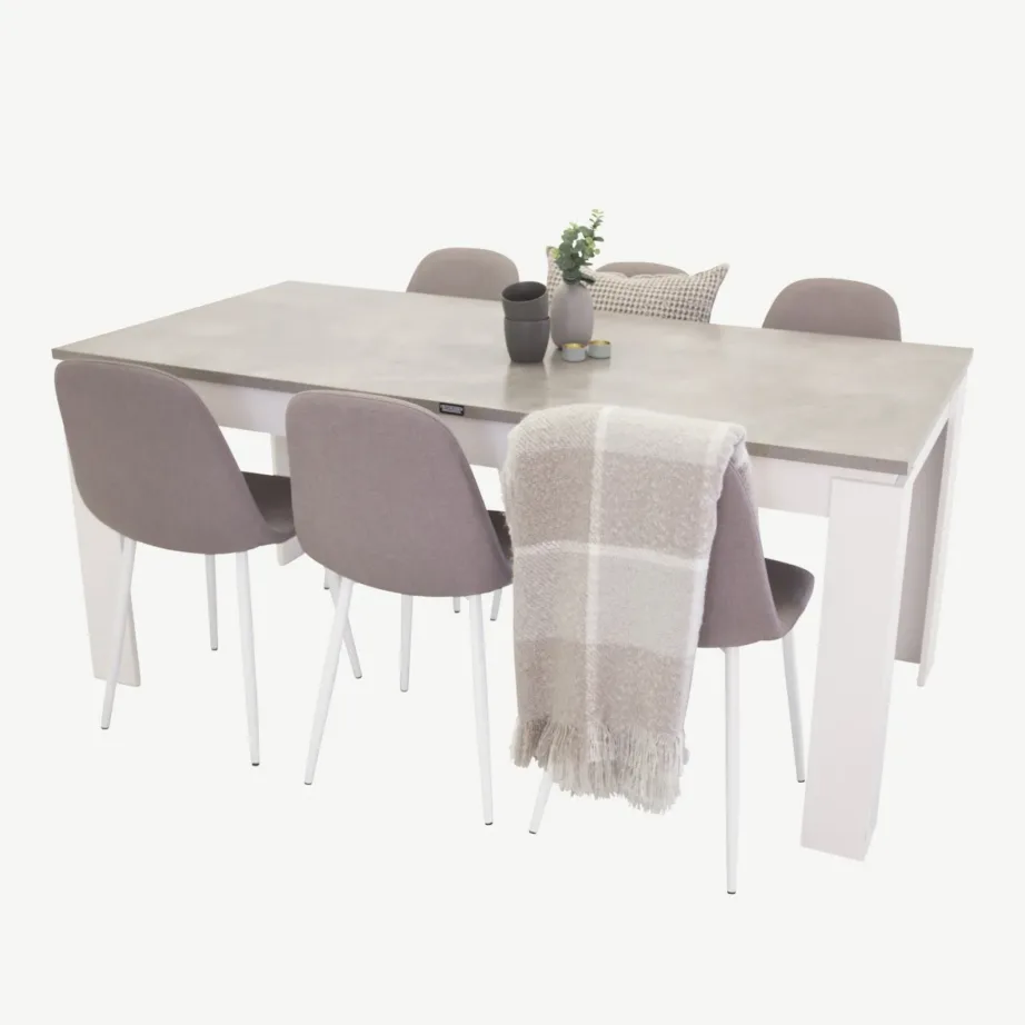 Hall polüesterkattega iste ühendub stiilselt valgete metalljalgadega, pakkudes ajatut ja universaalset lahendust nii modernsetesse kui klassikalistesse sisekujundustesse. Kergelt kumer seljatugi toetab istumist ja muudab tooli mugavaks ka pikkadel õhtusöökidel.