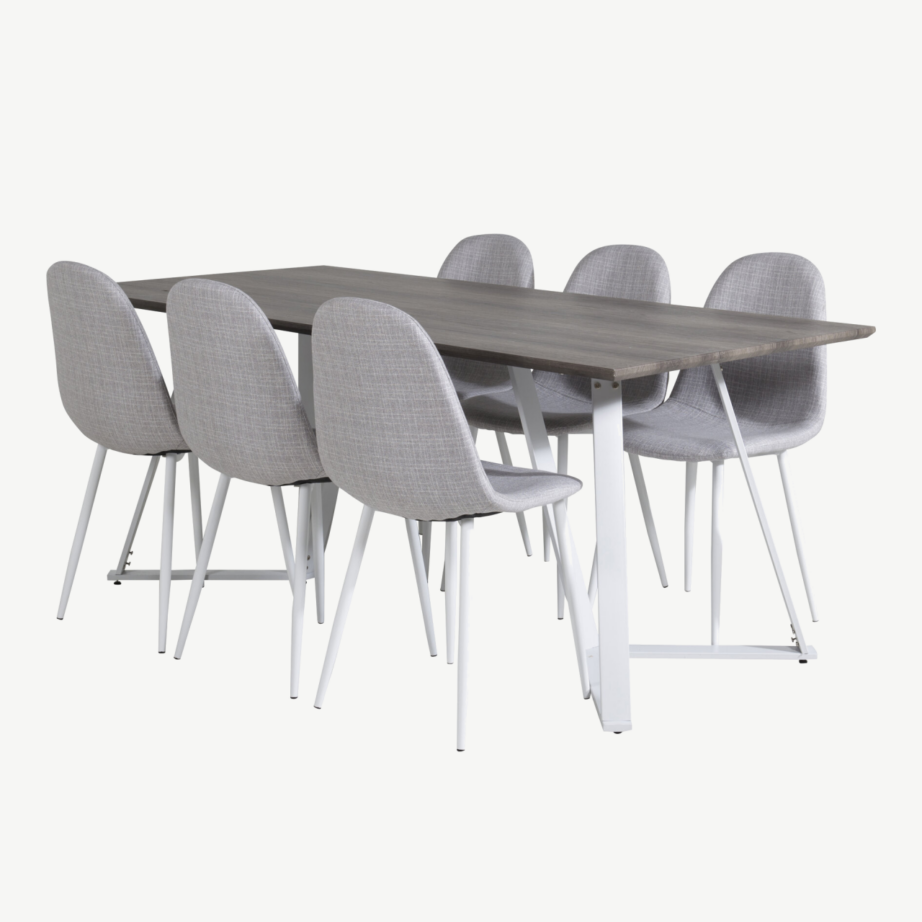 Hall söögilauakomplekt Marina toob Sinu söögituppa modernse disaini ja rahuliku põhjamaise õhkkonna. Komplekt hõlmab elegantset ristkülikukujulist Marina lauda halli puitimitatsiooniga lauaplaadiga ning kuut Polar tooli helehalli kangaga. Valged terasest lauajalad ja tooliraamid rõhutavad skandinaavialikku selgust ja avarust ning muudavad komplekti suurepäraseks valikuks igasse valgusküllasesse interjööri.
