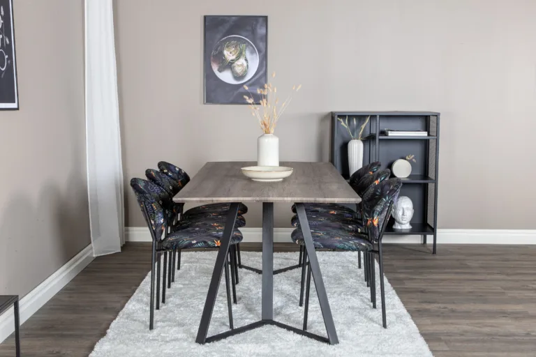 Tooge oma söögituppa värskust ja mugavust Marina halli söögilaua ning Vault kollektsiooni musta lillemustriga toolidega komplektiga. See stiilne ja mitmekülgne söögilaud toolidega on loodud pakkuma nii igapäevast hubasust kui ka erilisteks koosviibimisteks vajalikku elegantsi. Komplekti kuulub avar, MDF-ist valmistatud hall söögilaud (180 × 90 cm) ning kuus pehmet, vastupidava polüesterkangaga polsterdatud tooli.