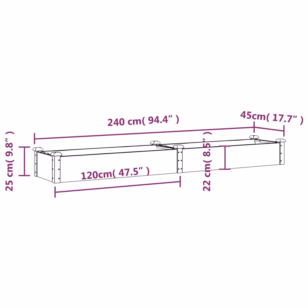 • Rohkelt kasvuruumi – 240 x 45 x 25 cm mõõtmetega kast mahutab palju mulda ning sobib erinevate taimede, juurviljade, ürtide ja lillede kasvatamiseks.