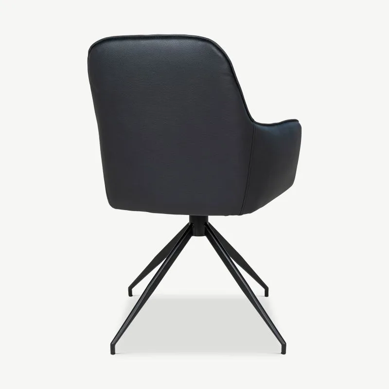 Mustast PU nahast polster ning pehme polsterdus tagavad mugavuse ka pikemate einete ajal. Vastupidav must metallraam lisab toolile stabiilsust ja toob esile selle ajatu stiili. Tänu 360° pöörlevale mehhanismile on tool eriti praktiline, võimaldades mugavat liikumist ümber laua.
