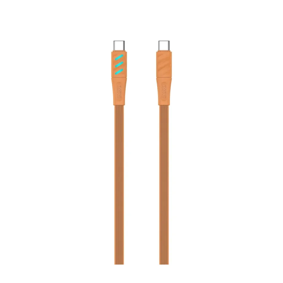 1 meetri pikkune oranž Havit CB6254 USB-C–USB-C kaabel toetab 60 W Power Delivery kiirlaadimist, sobib ideaalselt seadmete kiireks laadimiseks.