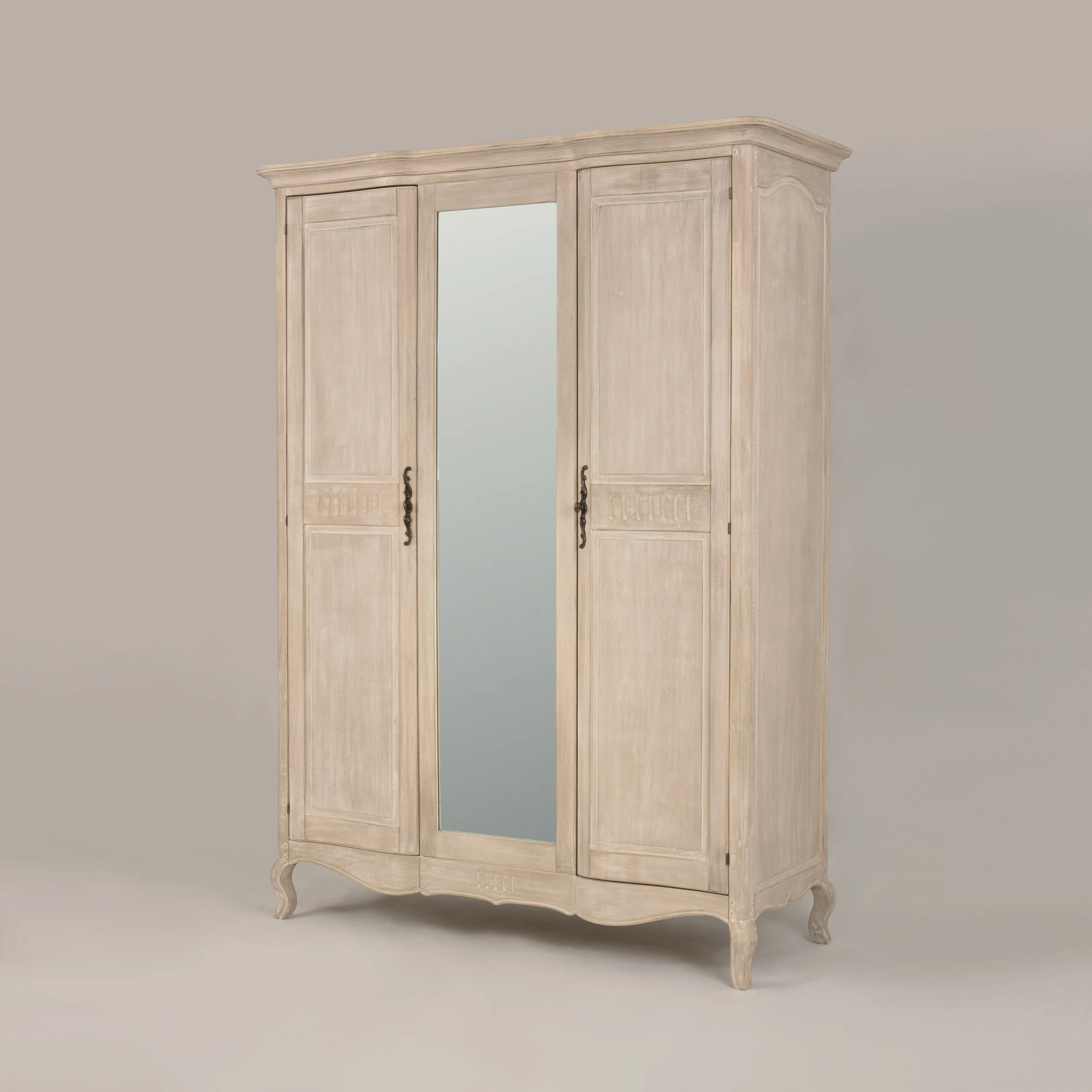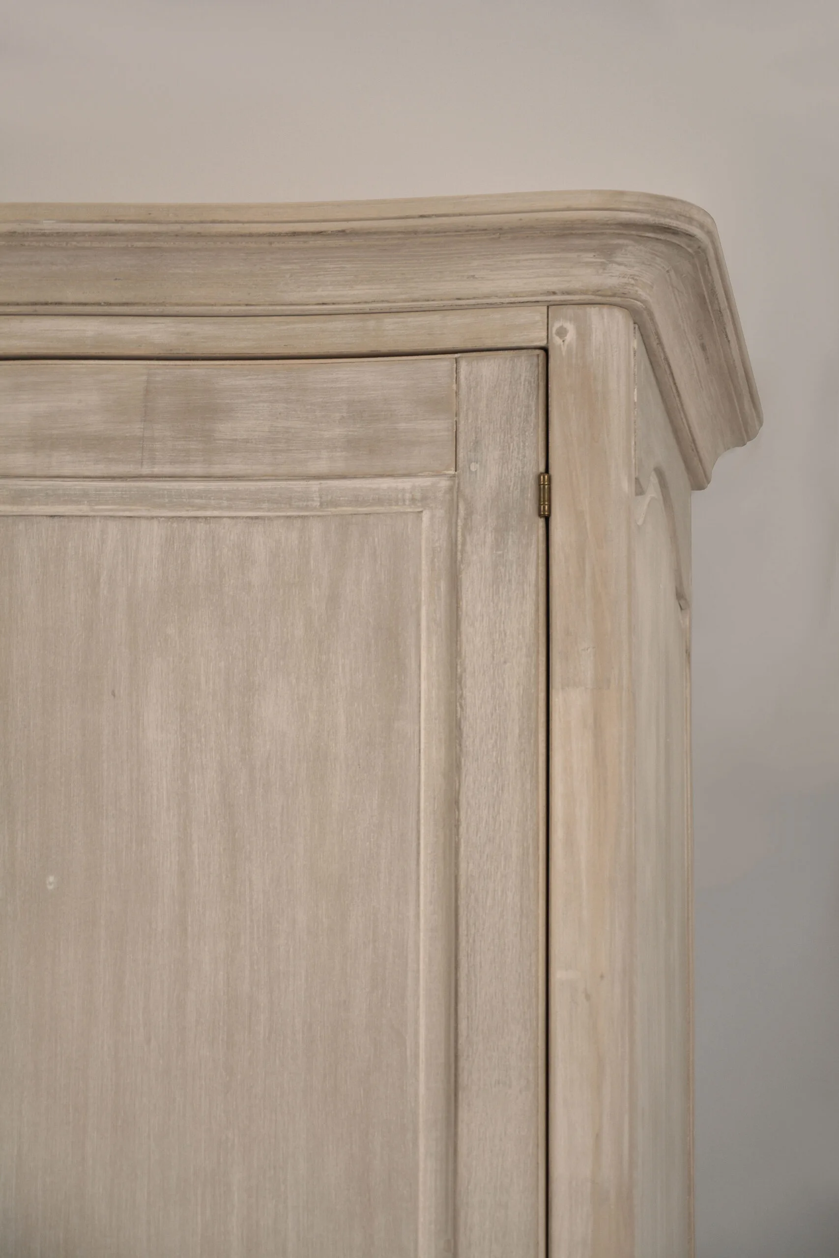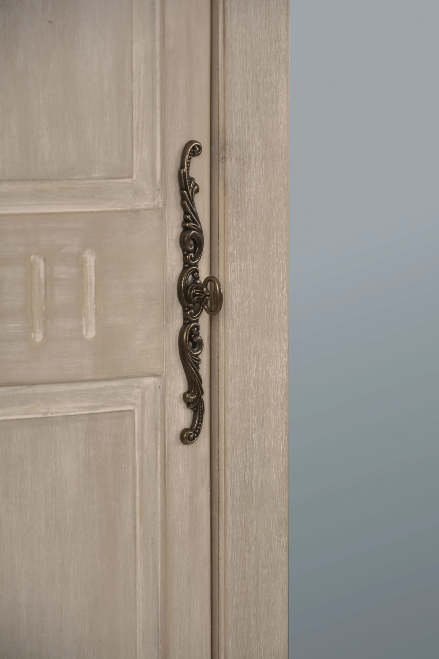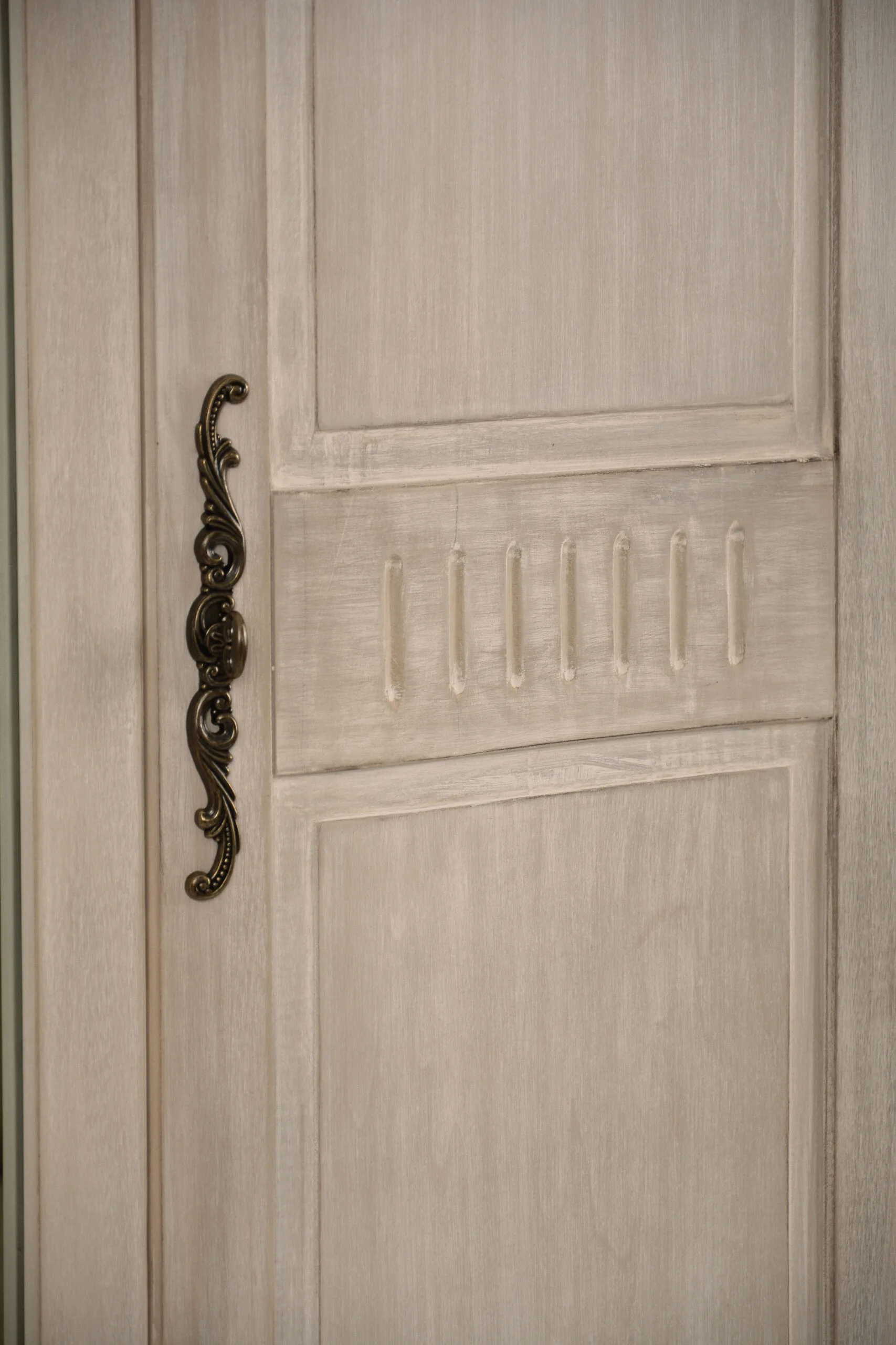 Venezia Bianco VEB886K riidekapp magamistuppa. See elegantne täispuidust riidekapp, millel on kaunilt kumerad freesitud jalad, on loodud provansa stiilis. Kapi korpus on elevandiluu toonis, poolläikiv, samas kui kapp ise on ebaühtlase, poolmati helebeeži värviga. Korpusel ja pealisel on iseloomulikud kooreüraskite jäljed ja dekoratiivsed needid, mis lisavad sellele ainulaadset võlu.