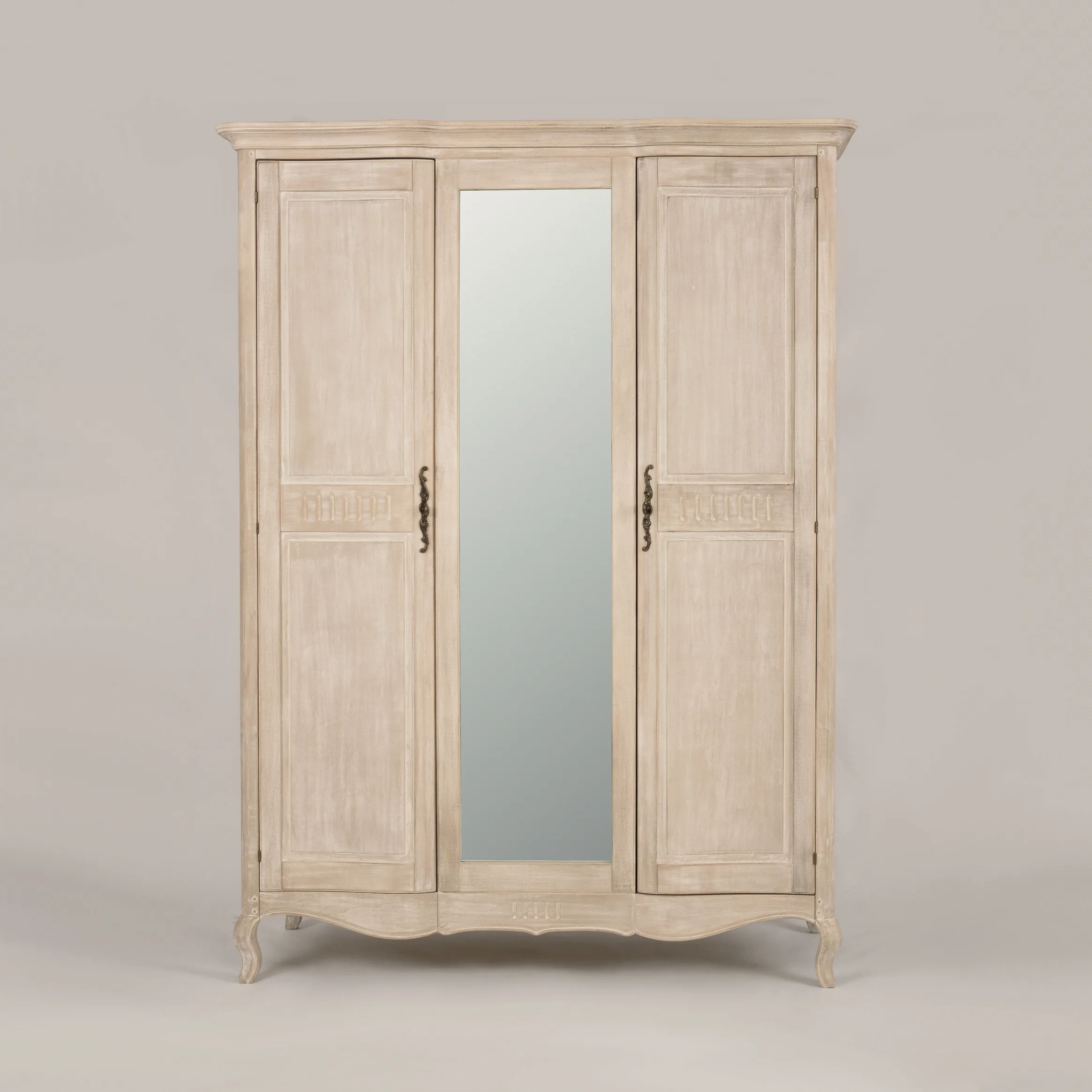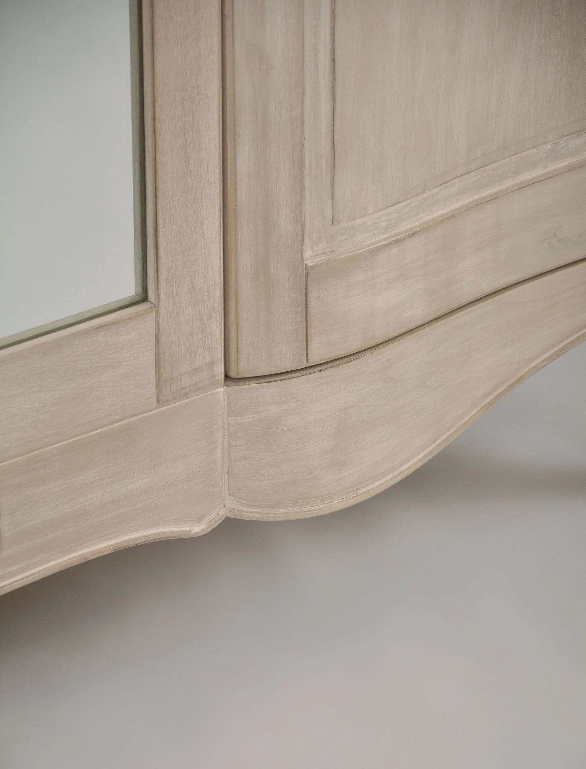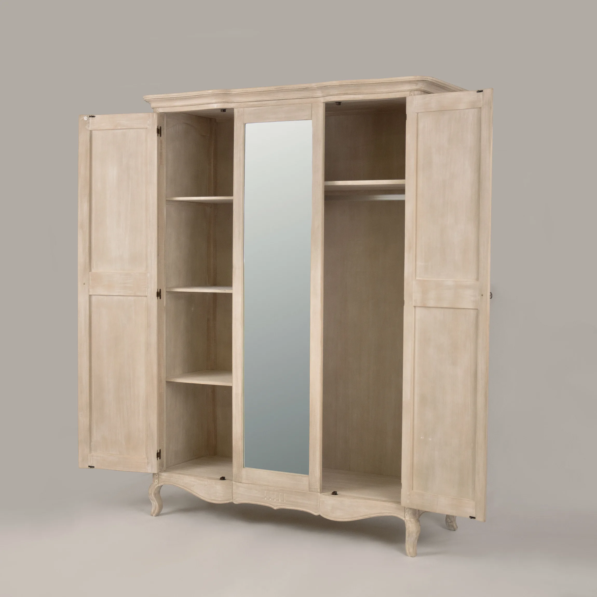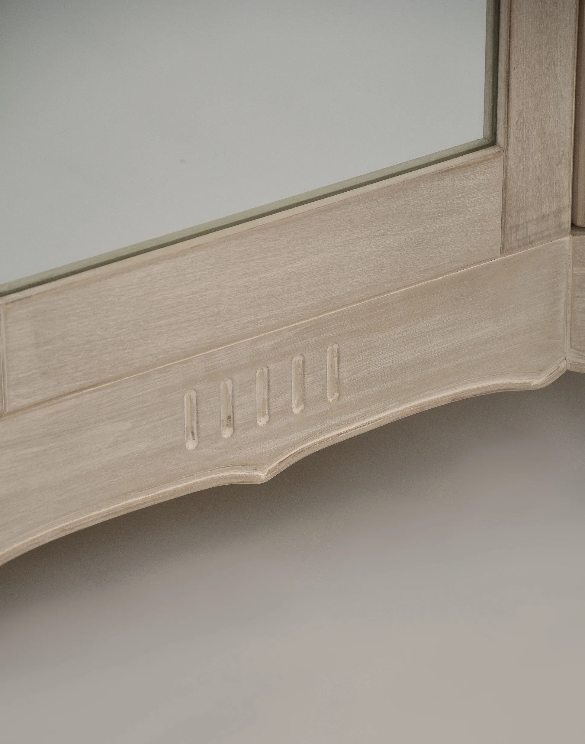 Venezia Bianco VEB886K riidekapp magamistuppa. See elegantne täispuidust riidekapp, millel on kaunilt kumerad freesitud jalad, on loodud provansa stiilis. Kapi korpus on elevandiluu toonis, poolläikiv, samas kui kapp ise on ebaühtlase, poolmati helebeeži värviga. Korpusel ja pealisel on iseloomulikud kooreüraskite jäljed ja dekoratiivsed needid, mis lisavad sellele ainulaadset võlu.