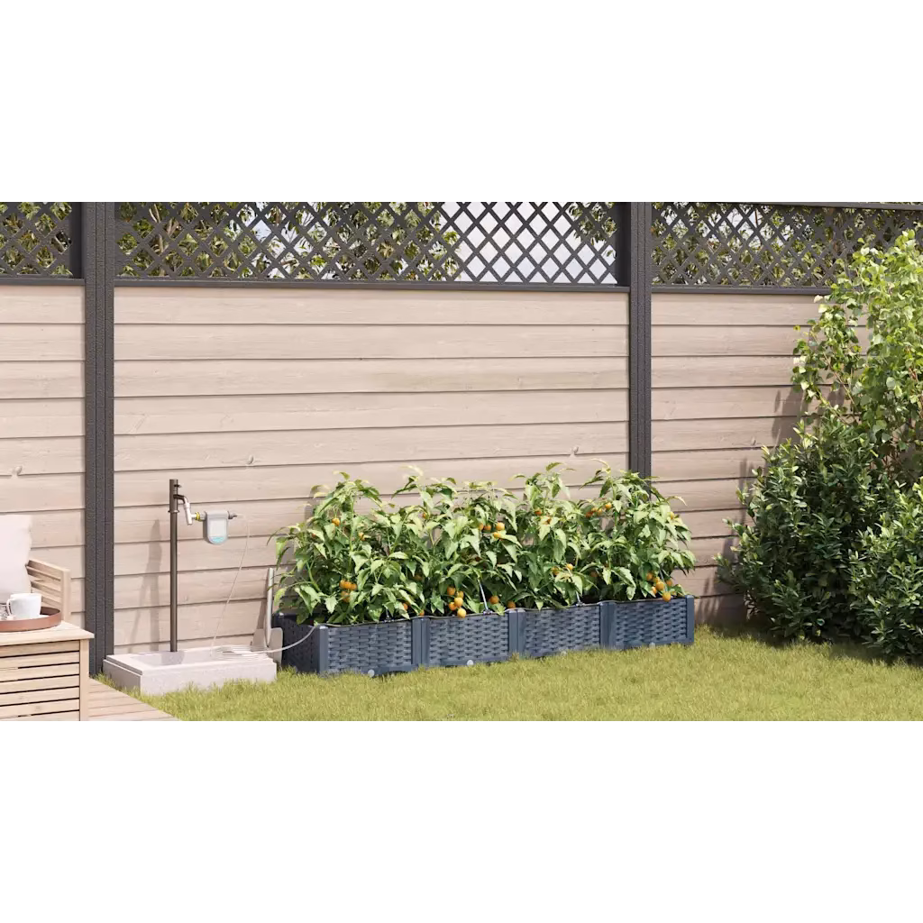 • Neli istutuskasti – komplektis on 4 istutuskasti, mis võimaldavad luua eraldi peenraid või rajada ühe pikema istutusala vastavalt vajadusele.