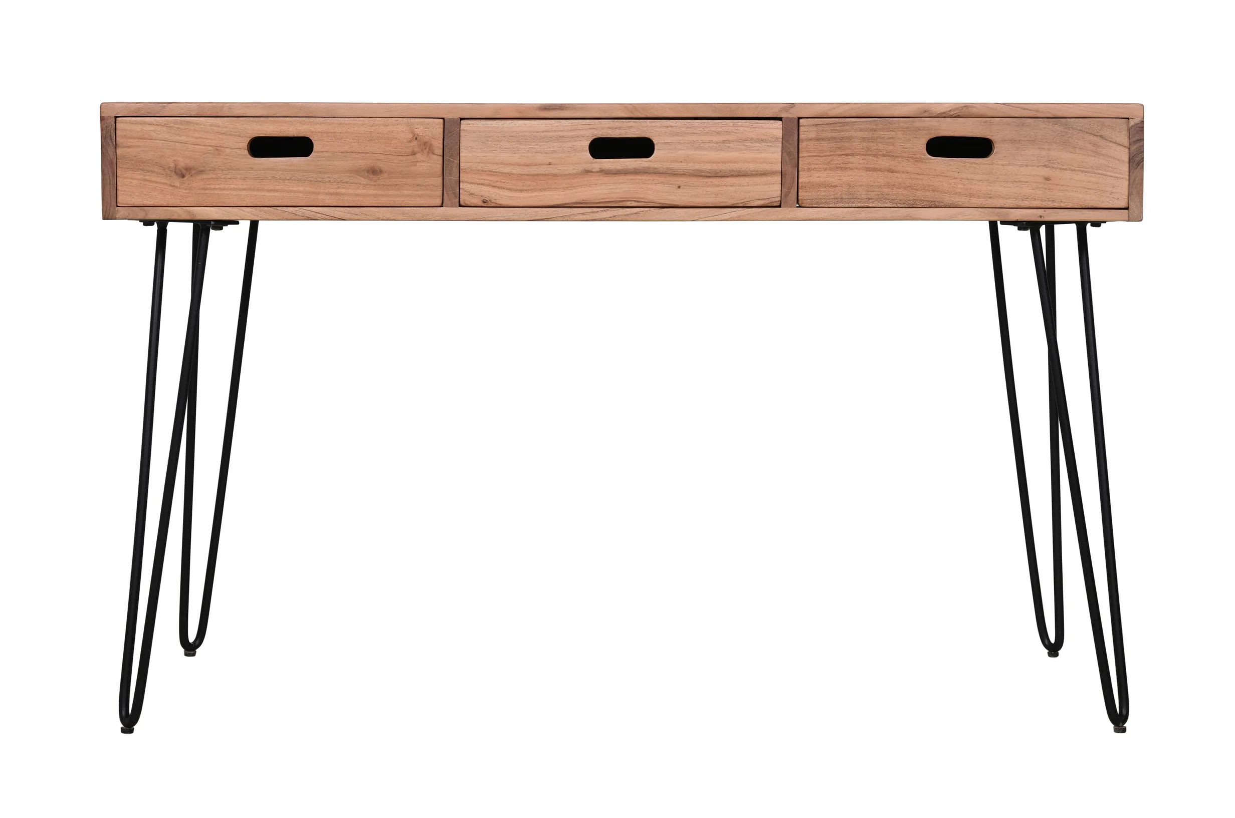 Avola AV2085-5020 kirjutuslaud kodukontorisse. See loft-stiilis kirjutuslaud on valmistatud naturaalses puidutoonis akaatsiapuust ning sellel on mustad metallist jalad, mis loovad stiilse ja funktsionaalse tööruumi. Laud on varustatud praktiliste sahtlitega ja sisseehitatud pistikupesa ning USB-portidega, mis muudavad elektroonikaseadmete kasutamise mugavaks.