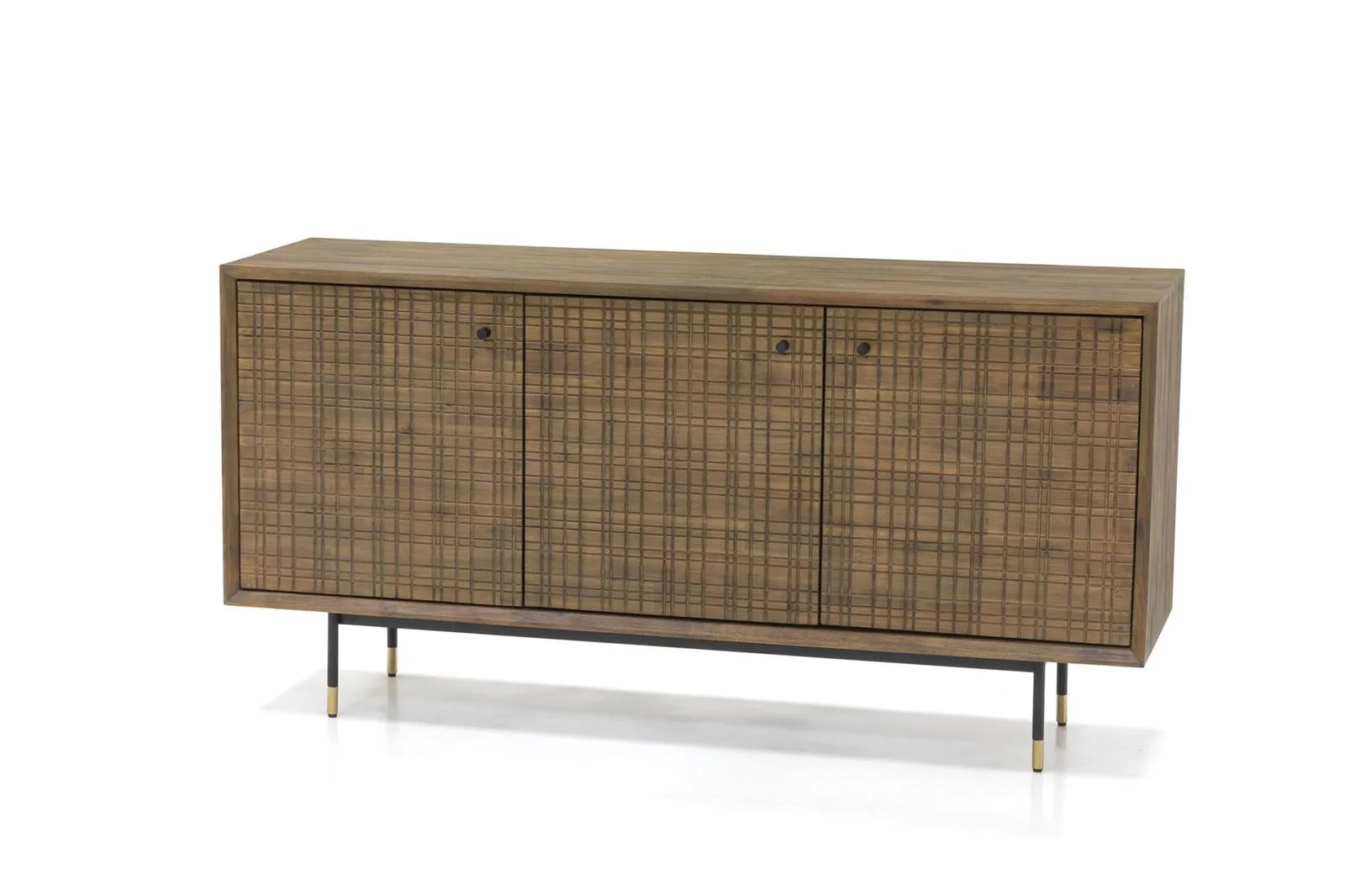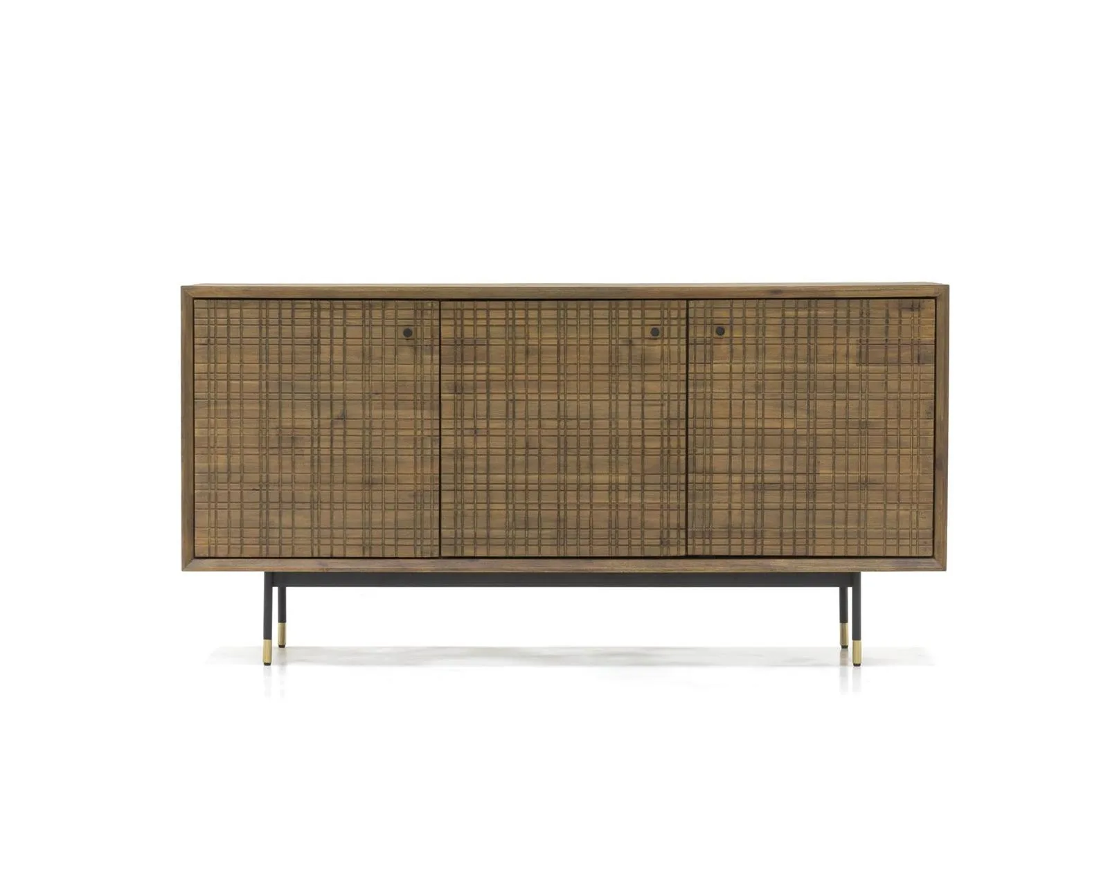 Maze MAZD01 kummut elutuppa. See ainulaadne kummut on valmistatud kvaliteetsest harjatud eksootilisest akaatsiapuidust, millel on metallist sirged käepidemed. Kapi esiküljed on kaunistatud 3D-struktuuriga, millel on asümmeetriline ruuduline muster, mis lisab interjöörile retrohõngu. Kapi metallist poolmati musta viimistlusega sirged jalad, millel on kuldsed aktsendid, annavad sellele elegantse ja ajatu välimuse.