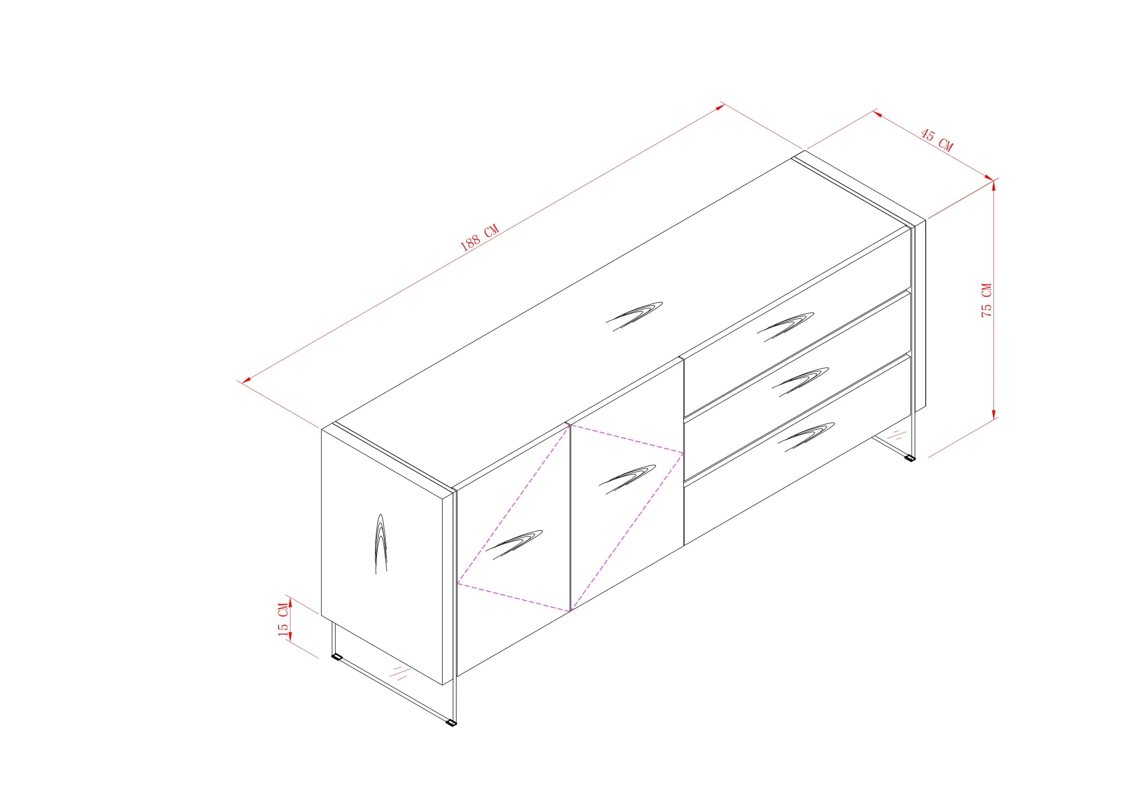 Mõõtmed: Laius 188 cm, sügavus 45 cm, kõrgus 75 cm.