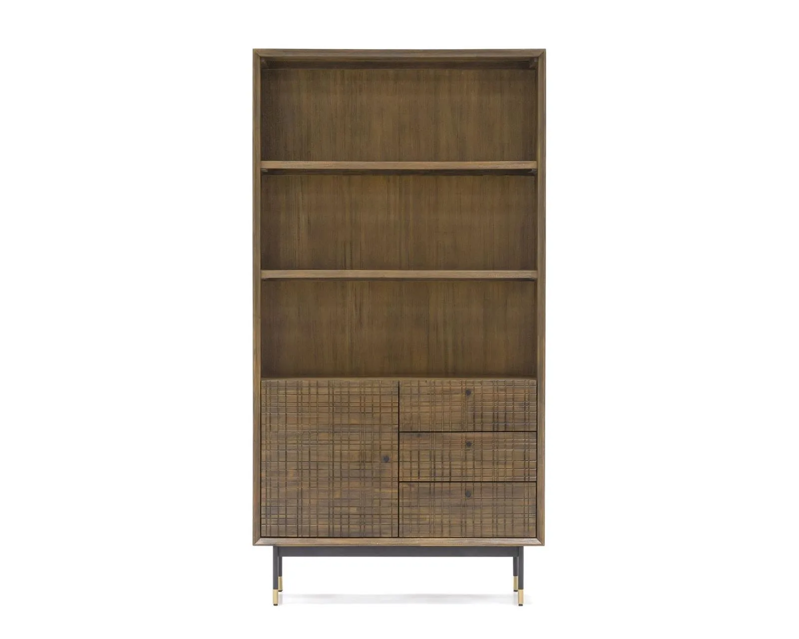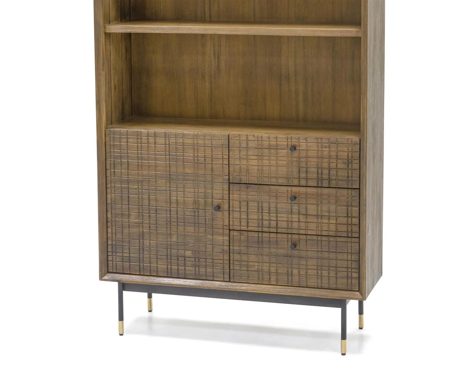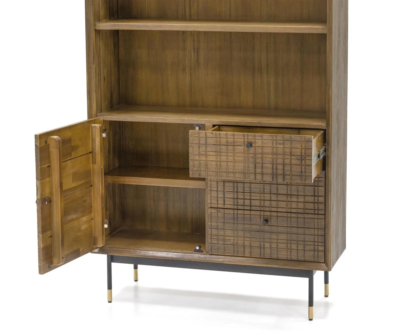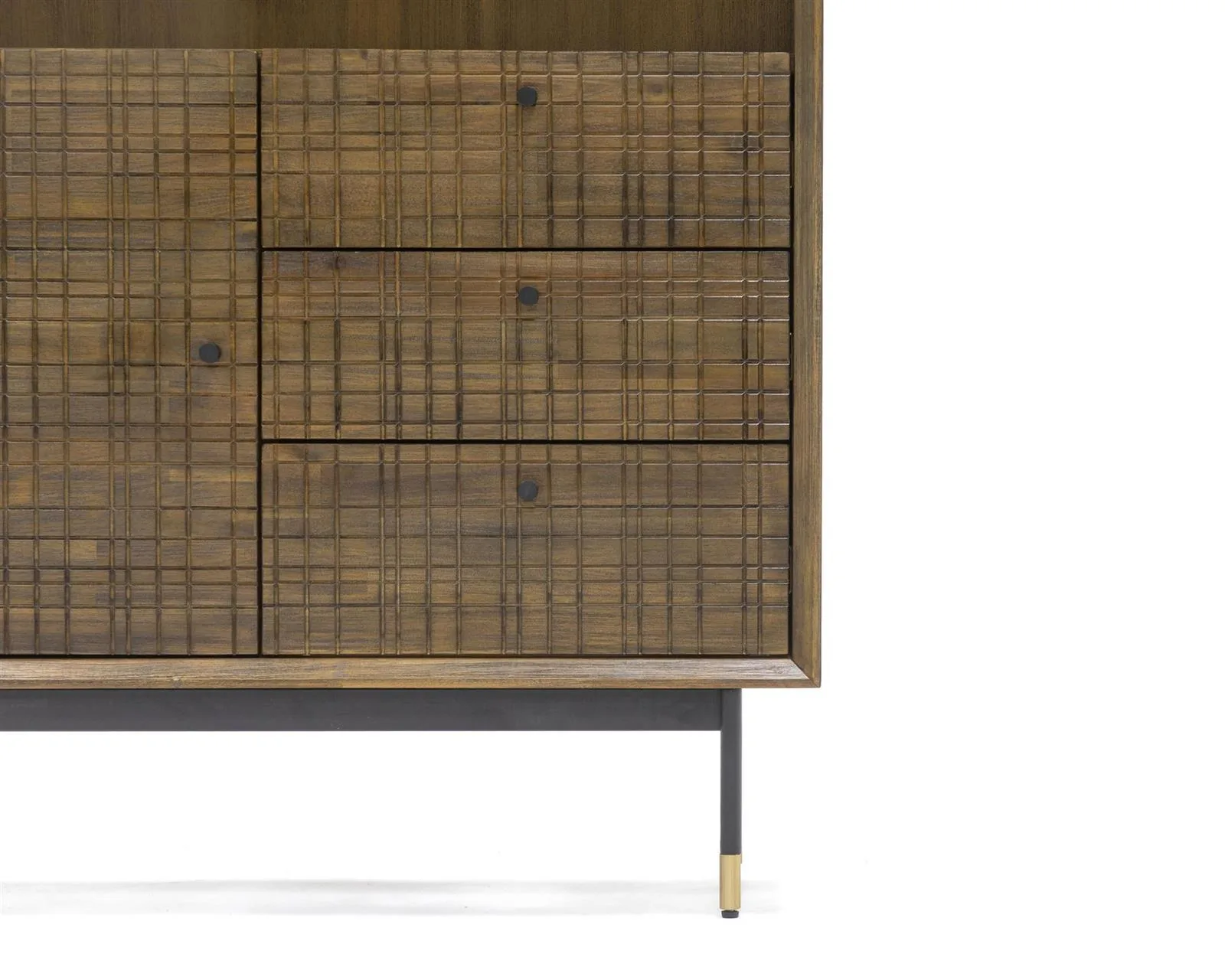 Maze MAZL02 raamaturiiul kodukontorisse. See ainulaadne retrostiilis raamaturiiul on valmistatud kvaliteetsest harjatud eksootilisest akaatsiapuidust, millele lisavad iseloomu metallist sirged käepidemed. Riiuli esipaneelidel on 3D-struktuur, millel on asümmeetriline ruuduline muster. Mustad poolmatt metalljalad kuldsete aktsentidega lisavad elegantsi ja stabiilsust.