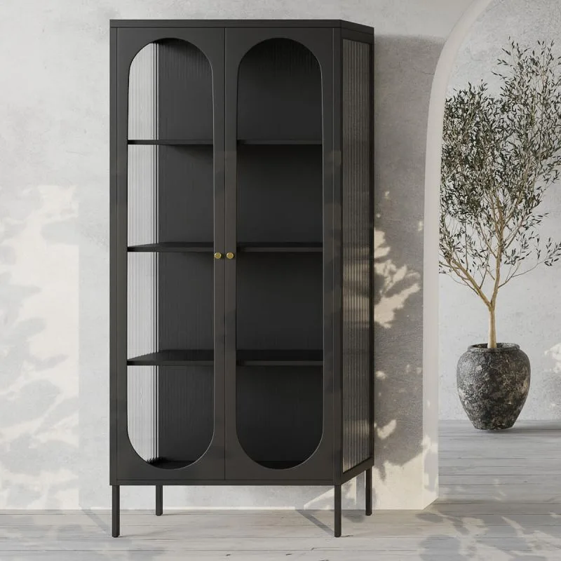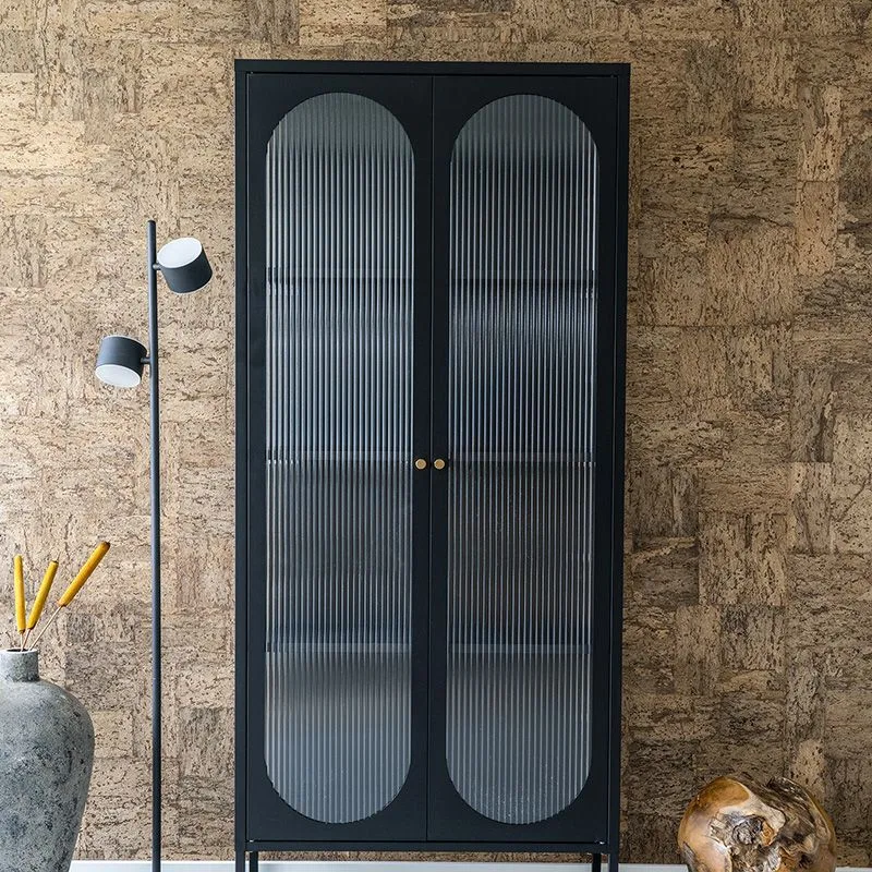 Kapi uksed on valmistatud soonilisest klaasist, mis lisab tekstuuri ning võimaldab hoida sisu osaliselt varjatuna. See detail annab kapile õhulisema ilme ja loob pehmema valguse peegelduse, muutes ruumi hubasemaks. Sooniline klaas rõhutab ka kapi retrohõngulist, kuid samas modernset disaini.
