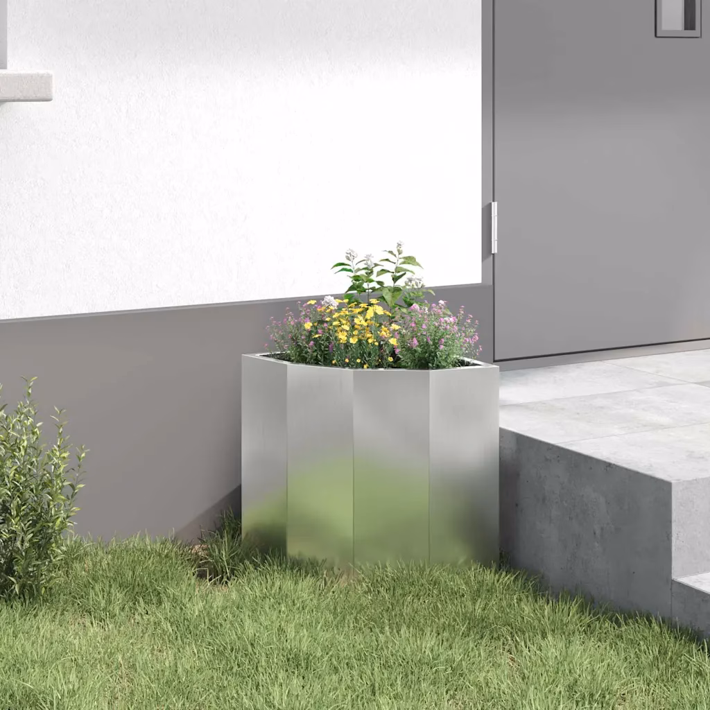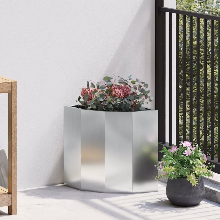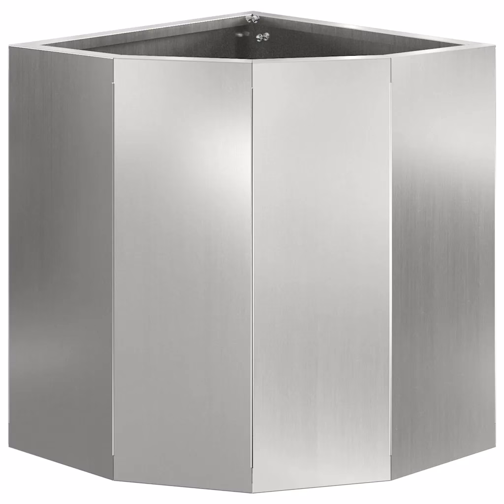 See hõbedane nurga istutuskast aitab maksimaalselt ära kasutada aias, terrassil või rõdul olevaid nurki ning luua rohkem istutusruumi. Tsingitud terasest konstruktsioon sobib hästi välitingimustesse ja minimalistlik välimus täiendab erineva stiiliga õuealasid.