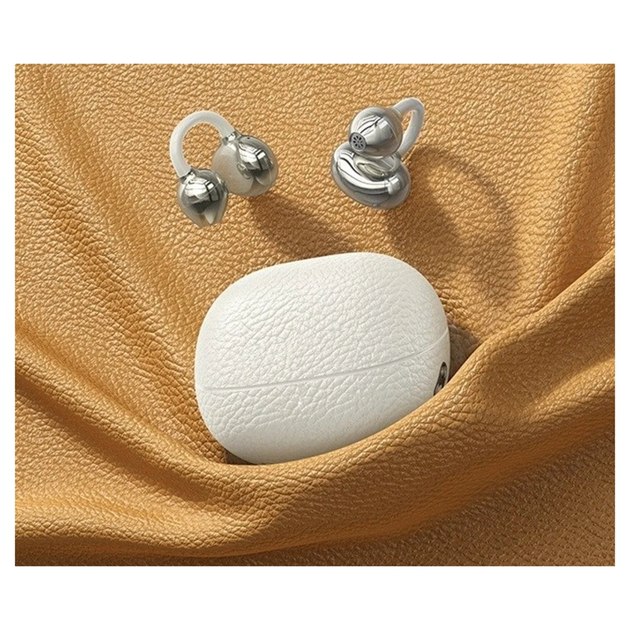 - Valged avatud disainiga bluetooth kõrvaklapid, modernne ja mugav kandmisviis