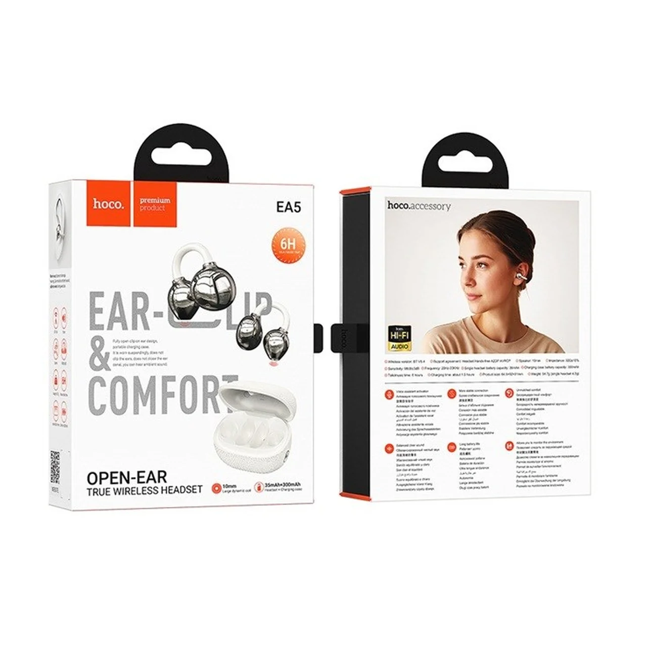 Valged juhtmevabad avatud disainiga Bluetooth kõrvaklapid Hoco EA5 DUKE III pakuvad mugavat kandmist ja kuni 6 tundi kõneaega laadimiskarbi abil.