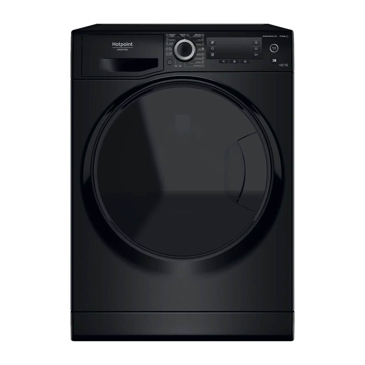 Must Hotpoint pesumasin-kuivati mahutab kuni 11 kg pesu ja 7 kg kuivatust, pakkudes LCD-ekraani ja aurufunktsiooniga mitmekülgseid ning tõhusaid pesuprogramme.