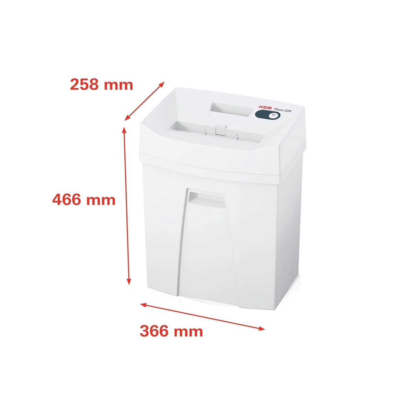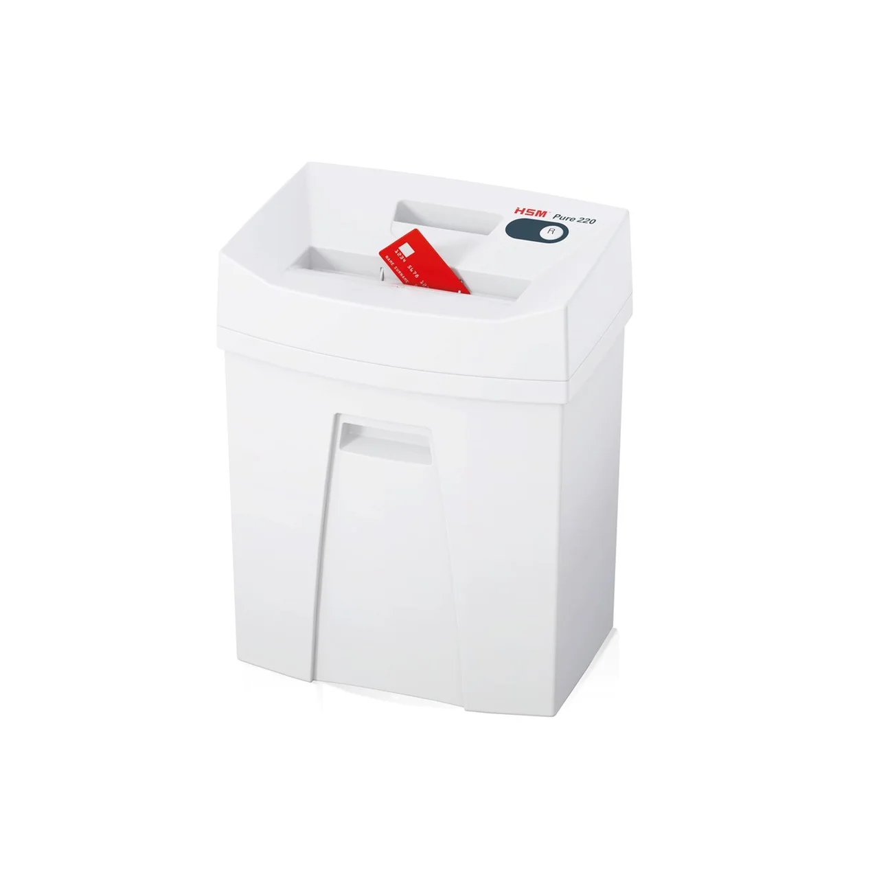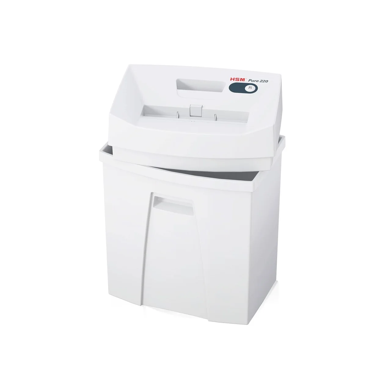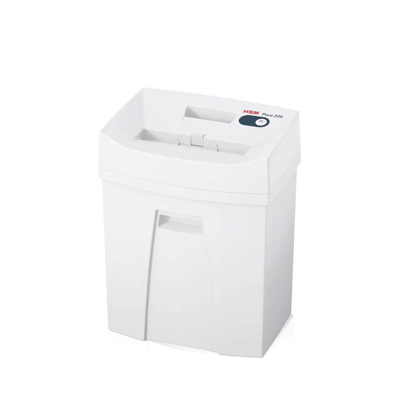 HSM Pure 220 valge paberipurustaja tagab usaldusväärse dokumentide ja tundliku teabe hävitamise kodus ning väikekontoris. Kompaktne ja kaasaegne lahendus on loodud kasutajatele, kes vajavad kõrge turbetasemega (P-4) osakesteks lõikavat paberipurustajat igapäevaseks tööks. Tänu automaatsele sisse- ja väljalülitusfunktsioonile ning ummistusevastasele kaitsele sobib Pure 220 ideaalselt neile, kes hindavad turvalisust, tõhusust ja töökindlust. Seadmega saab hävitada ka krediitkaarte ja klambreid, mis muudab selle mitmekülgseks valikuks.