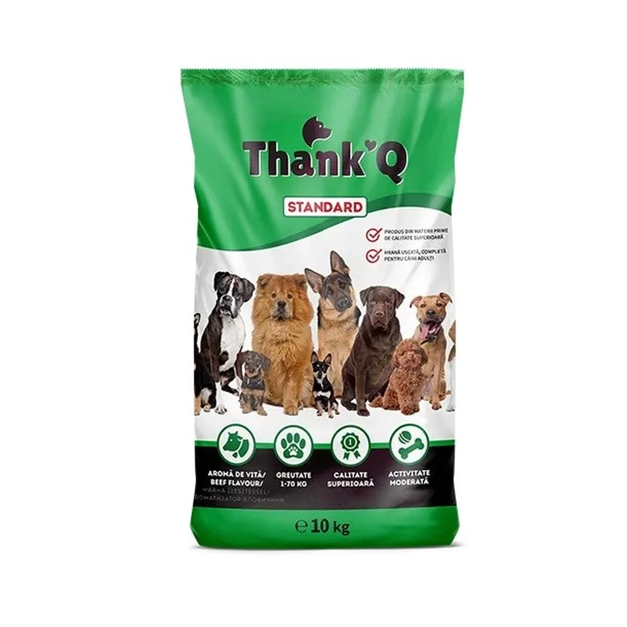 THANK'Q Standard Beef on täissööt kuivtoit, mis on mõeldud täiskasvanud koertele igapäevaseks toitmiseks. Kuivtoidu peamine maitse on veiseliha ning koostis sobib kõikidele koeratõugudele ja suurustele. Toode on sobiv neile, kes otsivad maitsvat, täisväärtuslikku ja suhkruvaba koeratoitu, mis võimaldab lemmikloomale pakkuda vajalikku energiat ning hoiab tema menüü mitmekülgsena ja tervislikuna. Koostises ei ole kunstlikke värvaineid ning toit sobib normaalse aktiivsusega koertele.
