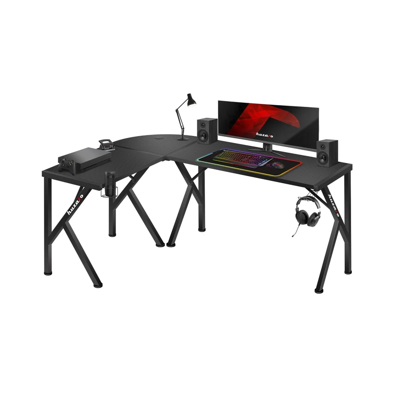 Huzaro Hero 6.3 on must L-kujuline süsinikkiust lauaplaadi ja terasraamiga gaming-laud, millel on kaablihaldus, tassihoidja ja klapikonks.