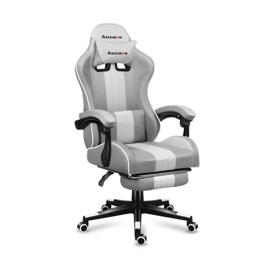 Valge ja halli kangaga Huzaro mänguritool pakub ergonoomilist tuge, reguleeritavat jalatuge ning pehmet polstrit mugavaks jahedaks istumiseks.