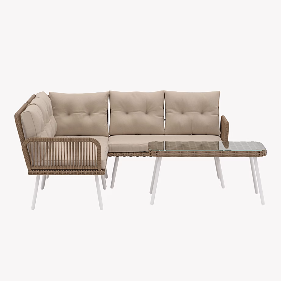 Ibiza nurgadiivanikomplekt loob sinu terrassile, aeda või rõdule kutsuva ja lõõgastava atmosfääri. L‑kujuline nurgadiivan mugavate beežide patjadega sobib suurepäraselt nii rahulikeks puhkehetkedeks, õhtuseks einestamiseks kui ka sõpradega jutuajamiseks värskes õhus. Komplekti kuuluv madal klaaslauaga laud pakub praktilist pinda jookide, suupistete või dekoratsioonide jaoks, nii et kõik vajalik on käeulatuses. Tänu naturaalset tooni vitspunutisele ja pehmetele beežidele patjadele sulandub Ibiza sujuvalt erinevatesse väliruumidesse – alates modernsest linnabalkonist kuni rohelise aianurgani.