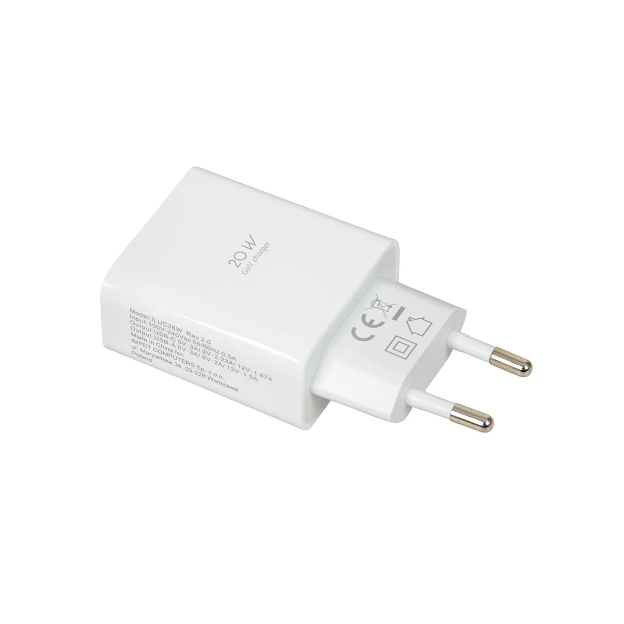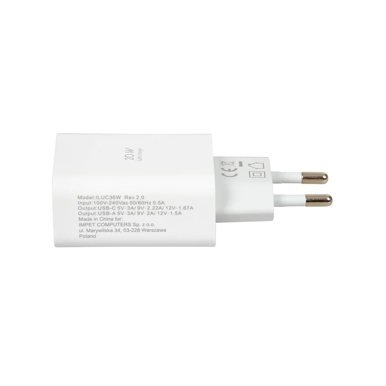 iBOX ILUC36W C-36 valge 20W GaN kiirlaadijaga seinalaadija USB-C PD 3.0 ja USB-A, universaalne, komplektis USB-C kaabel