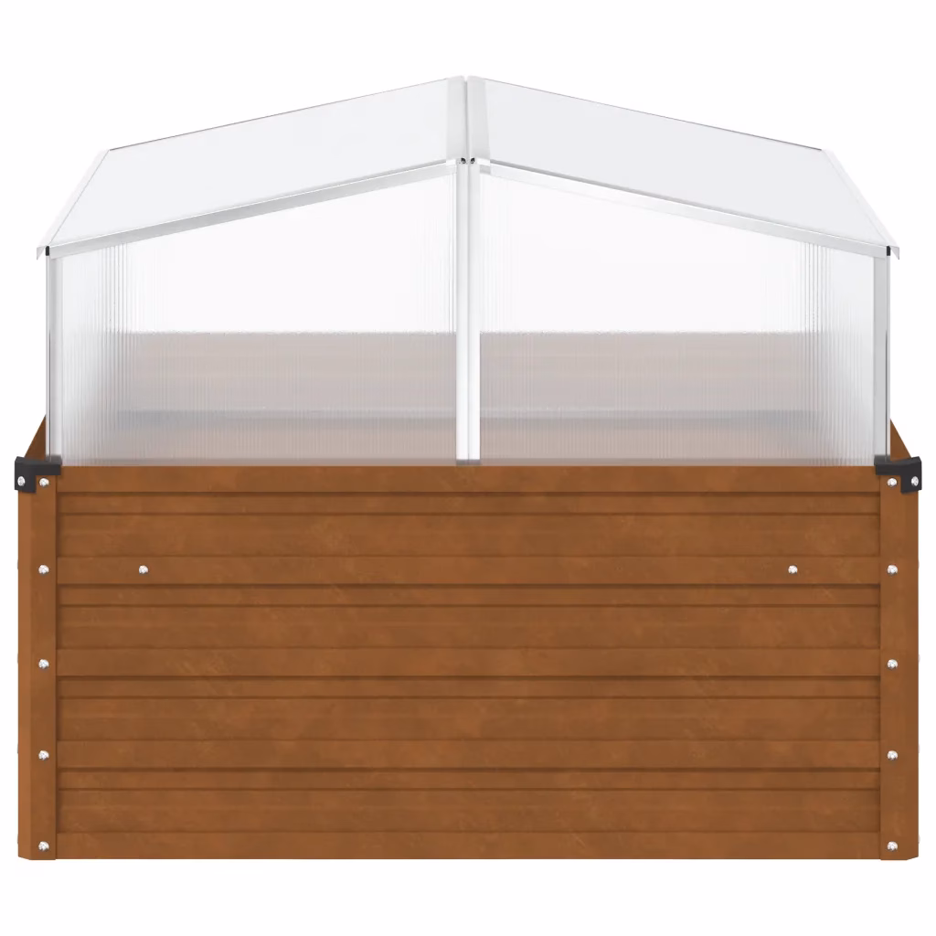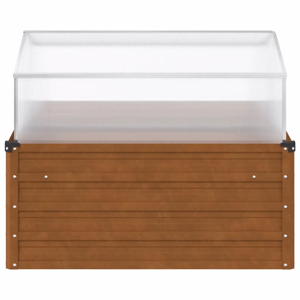 See taimekast ühendab vastupidava metallkonstruktsiooni ja <strongpraktilise kasvuhoonelise ülaosa, pakkudes taimedele kaitstud kasvukohta kogu hooaja vältel. Pruun ilmastikukindel teras sobib erinevatesse aedadesse ja terrassidele ning avatud põhi koos sügava mullakihiga tagab taimedele tugevad juured ja hea kasvu.