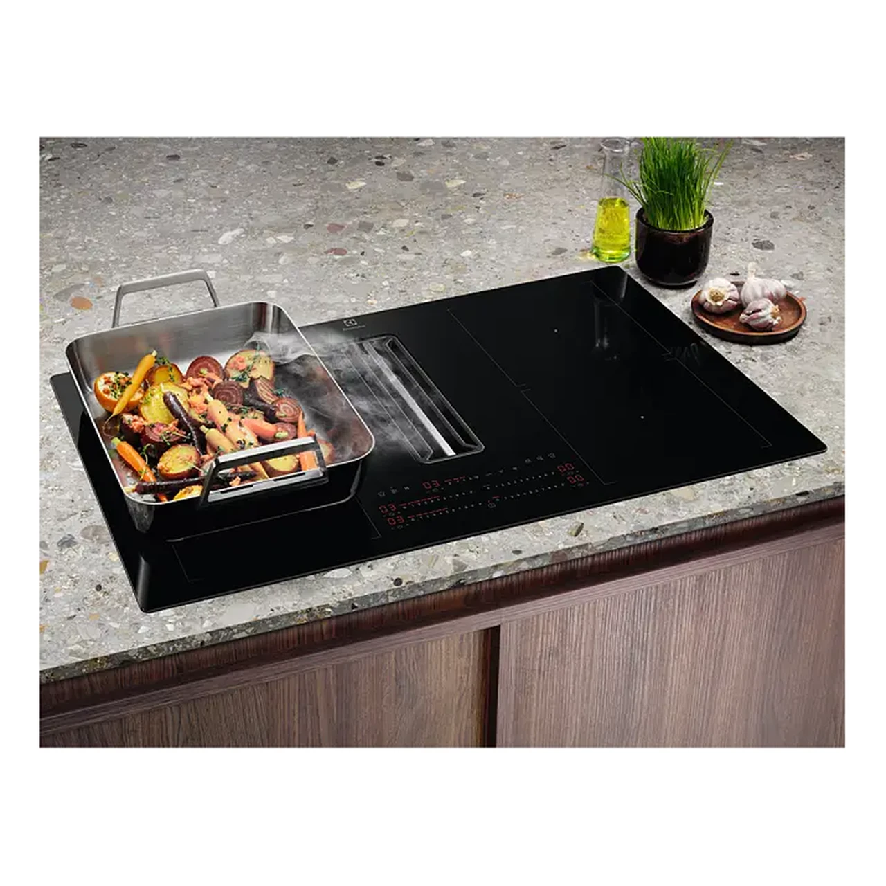 Induktsioonpliit Electrolux 800 Bridge koos eXTractor lahendusega annab rohkem paindlikkust köögi paigutuse kavandamisel. Õhupuhasti on integreeritud pliidiplaati, seega ei pea seda paigaldama pliidi kohale seinale ega lakke. See on eriti mugav köögisaare, avatud köögi või madalama laega ruumide puhul, kus on soov hoida köök võimalikult avatud ja õhuline.