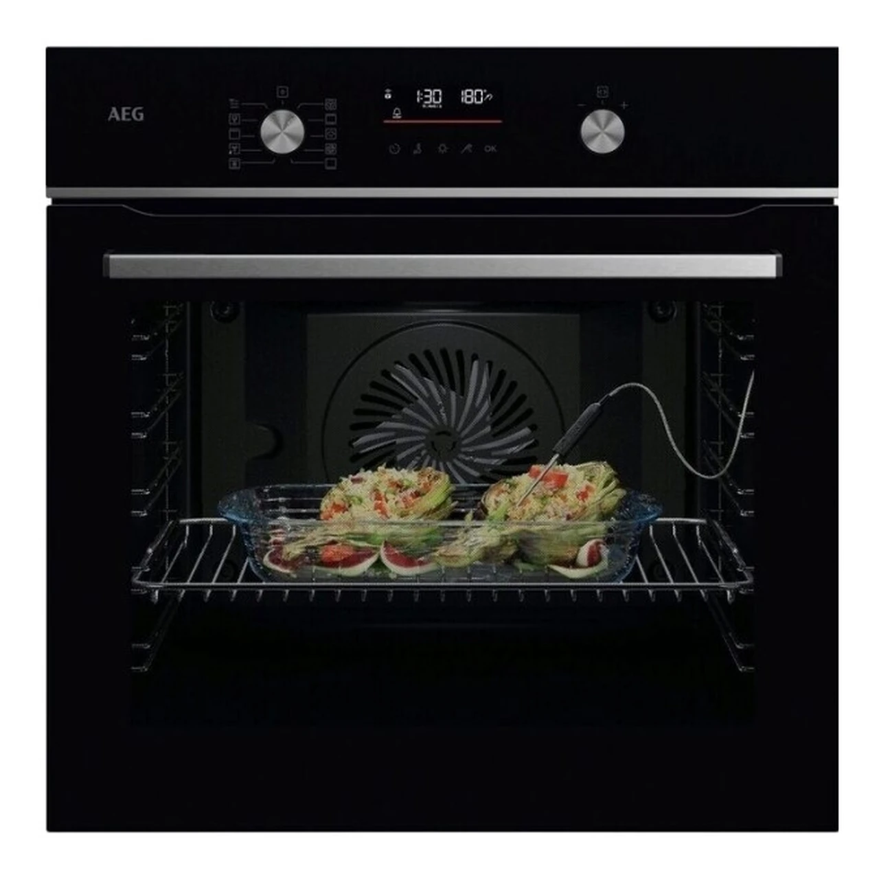Toidutermomeetri kasutamiseks aseta andur roa kõige paksemasse ossa ja vali termomeetri programm seejärel määra soovitud sisetemperatuur. AEG OS6CB531AB jälgib temperatuuri ning annab märku kui tulemus on saavutatud seejärel saad soovi korral küpsetuse lõpetada või järeeküpsetust lühidalt jätkata. Viivituse ehk alguse ja lõpu ajafunktsiooni abil saad küpsetuse planeerida nii et toit oleks valmis sobival ajal.