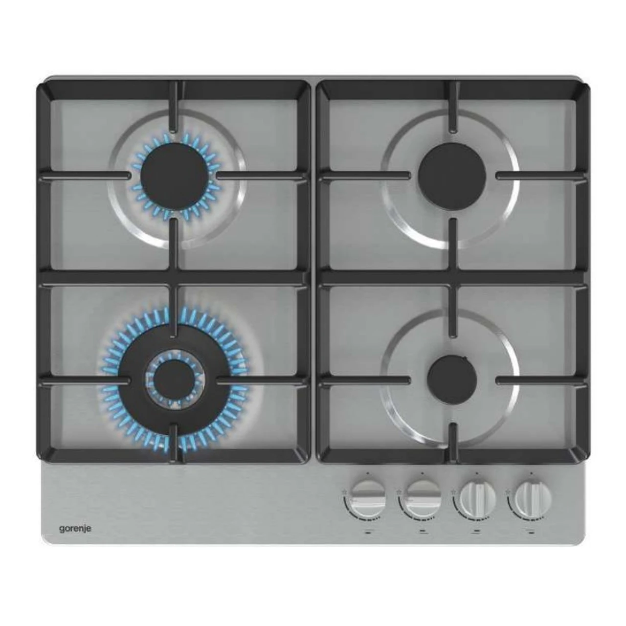 Integreeritav gaasipliidiplaat WOK-põletiga Gorenje GW641XHF, 60 cm, roostevaba teras, 4 põletit, malmist pannirestid, nuppjuhtimine, elektrisüüde, leegivalve, LPG düüsid, pealtpaigaldus