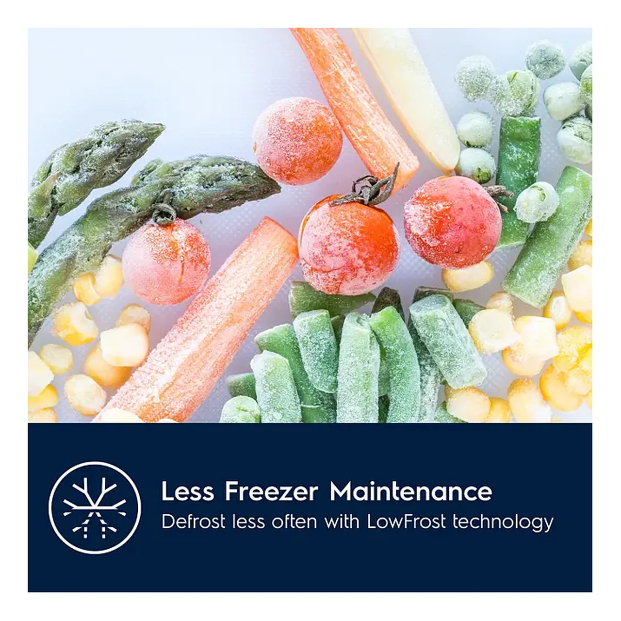 Integreeritud LowFrost süsteem hoiab sügavkülmikus temperatuuri ühtlasemana, mis omakorda vähendab jää ja härmatise teket siseosadele. Nii ei pea sügavkülma nii tihti käsitsi sulatama ning külmiku jõudlus püsib paremana. Väiksem härmatis tähendab ka seda, et sahtleid on lihtsam välja tõmmata ja pakendid ei külmu nii kergesti kokku.