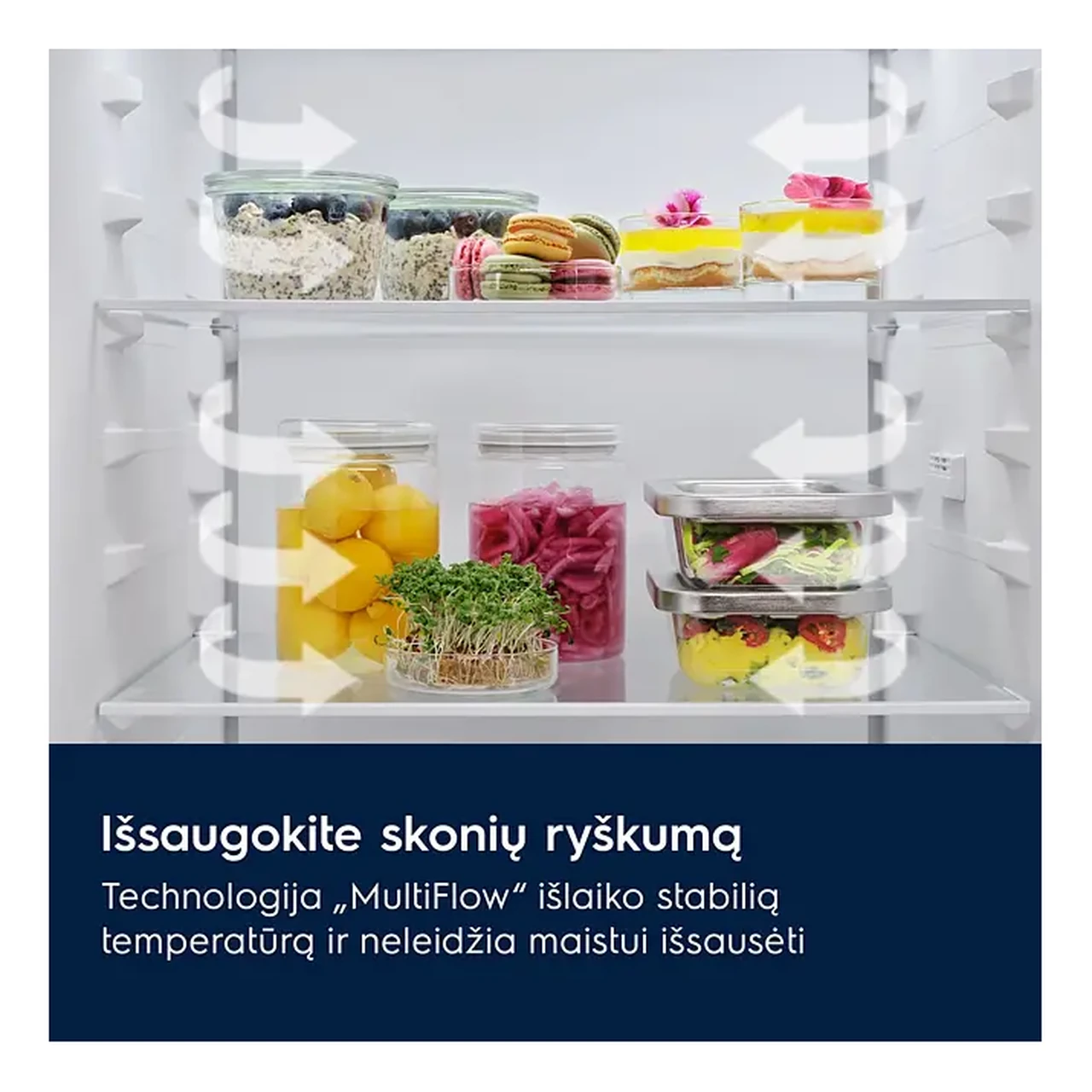 - MultiFlow õhuringlus jaotab jaheda õhu ühtlaselt kõikidele riiulitele, et temperatuur ja niiskus püsiksid stabiilsena ning toidud säiliksid ühtlasemalt.