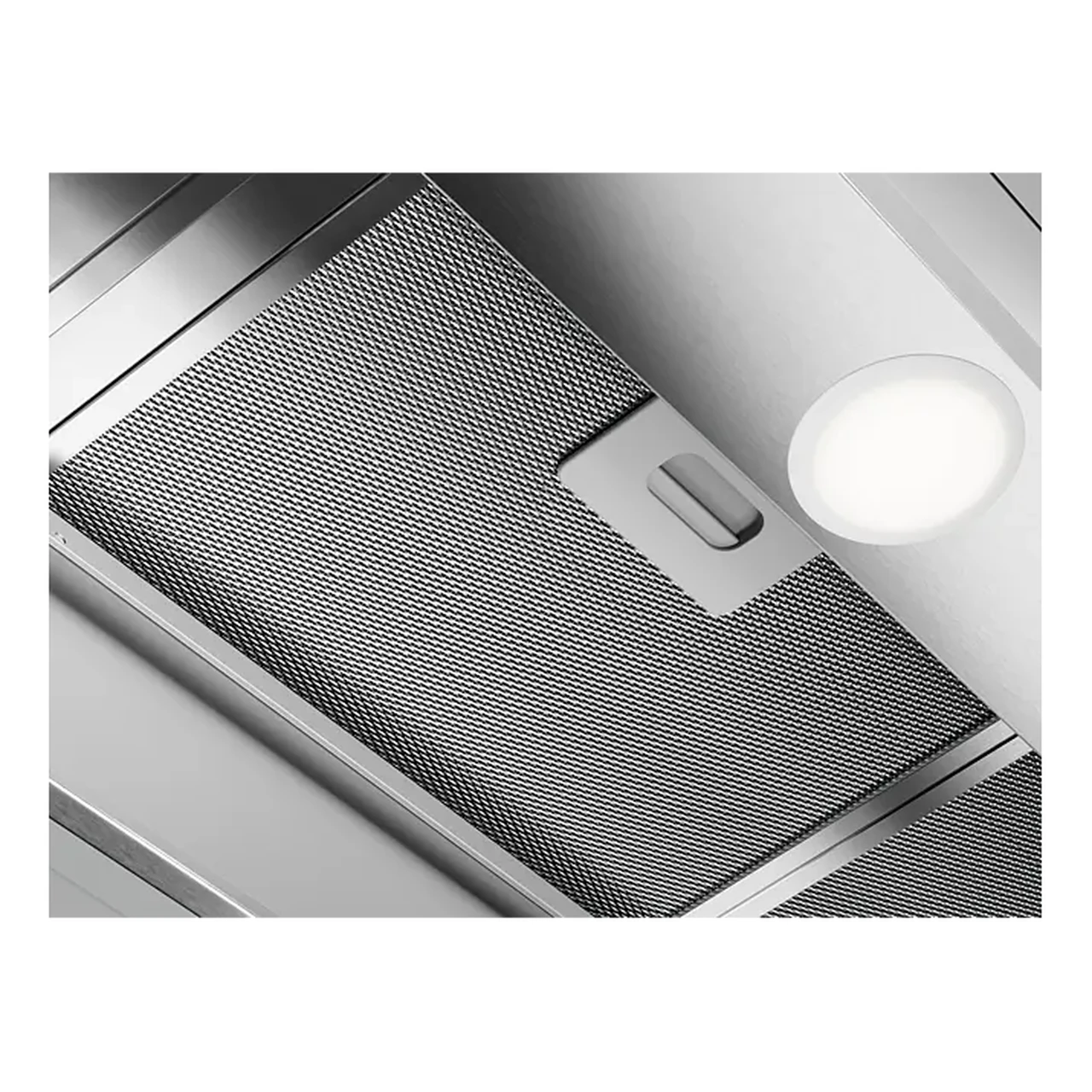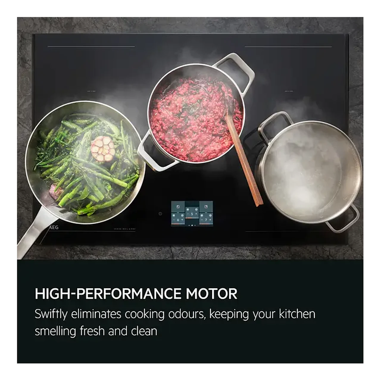 ExtractionTech Pro tehnoloogia ja AEG võimas mootor tagavad tõhusa õhuvahetuse nii igapäevase kui intensiivse toiduvalmistamise ajal. Õhuvool on tavarežiimis vahemikus umbes 300–580 m³/h ning intensiivsel astmel kuni 700 m³/h, mis aitab kiiresti eemaldada aurud ja lõhnad. Perimeertõmme suunab õhu sissevõtu paneeli äärtesse, parandades tõhusust ja vähendades otsest müra tunnetust.
