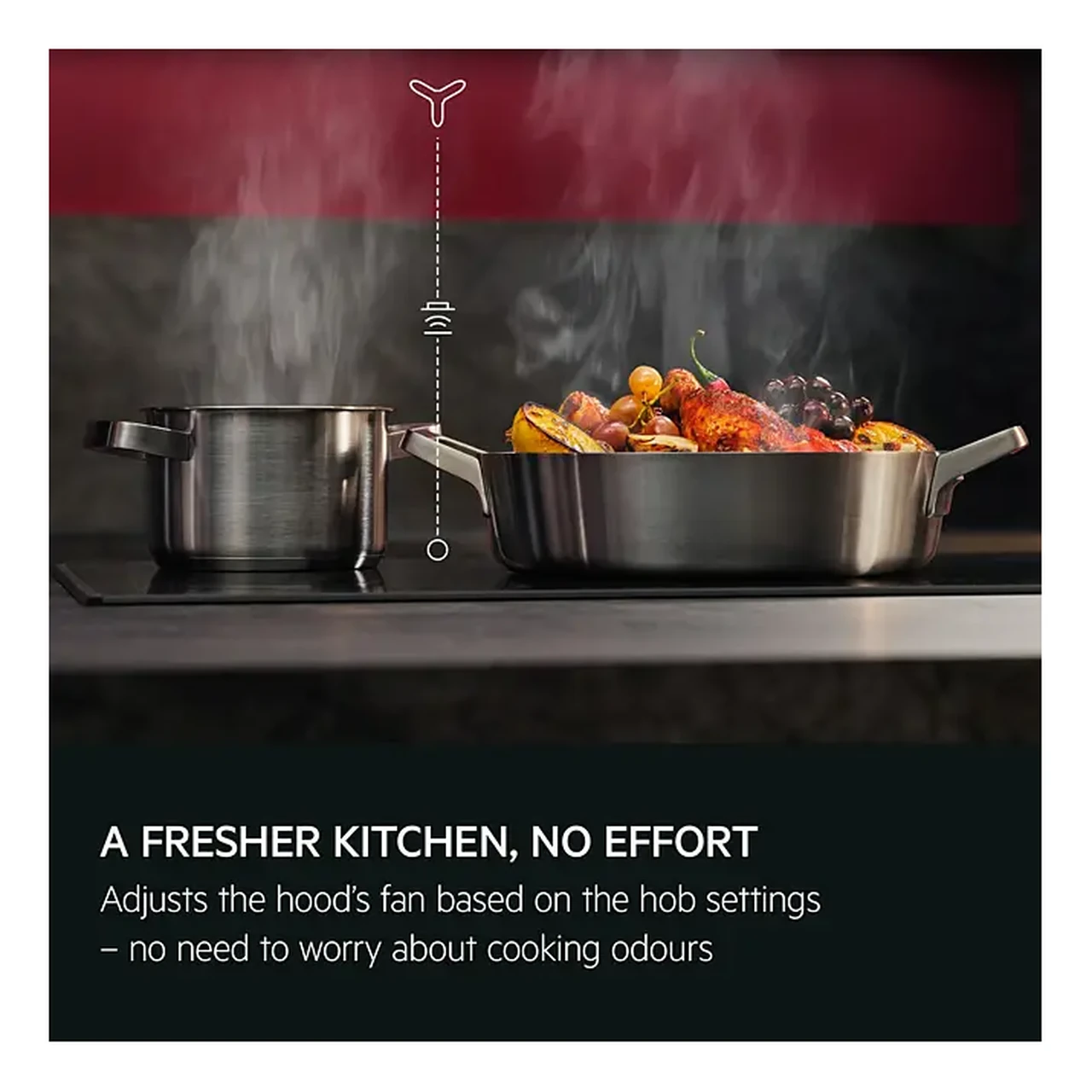 6000 seeria Hob2Hood® funktsioon ühendab õhupuhasti sobiva pliidiplaadiga traadita teel. Kui lülitad pliidiplaadi sisse, aktiveeruvad automaatselt õhupuhasti tuled ning ventilaator kohandab tõmbe tugevust vastavalt kuumuse tasemele. Nii on toiduvalmistamise ajal vähem käsitsi seadistamist ja köögis püsib ühtlaselt värskem õhk.
