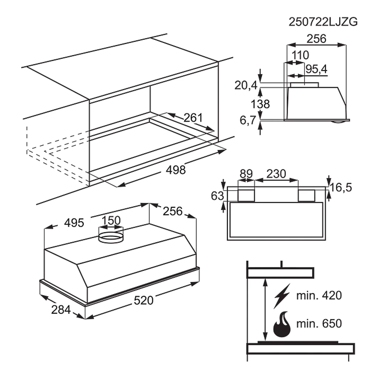Õhupuhasti sobib köögimööblisse, kus on u 55 cm laiune kapivahe ja piisav sügavus ligikaudu 28 cm paigaldamiseks. Seade on mõeldud töötama duct out lahendusena, mis tähendab, et see tuleb ühendada ventilatsioonitoruga, mille läbimõõt on 150 mm. Juhtmevaba ühendust pliidi ega nutiseadmetega ei ole ning korstnamoodulit ei ole ette nähtud.