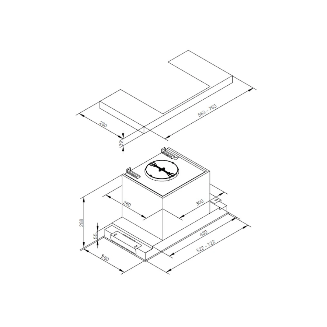 - Integreeritav lahendus 60 cm pliidiplaadi kohale – õhupuhasti ehitatakse peitu ülemisse kappi, nähtavale jääb vaid diskreetne must klaasesipaneel, mis sobitub kaasaegse köögimööbliga.