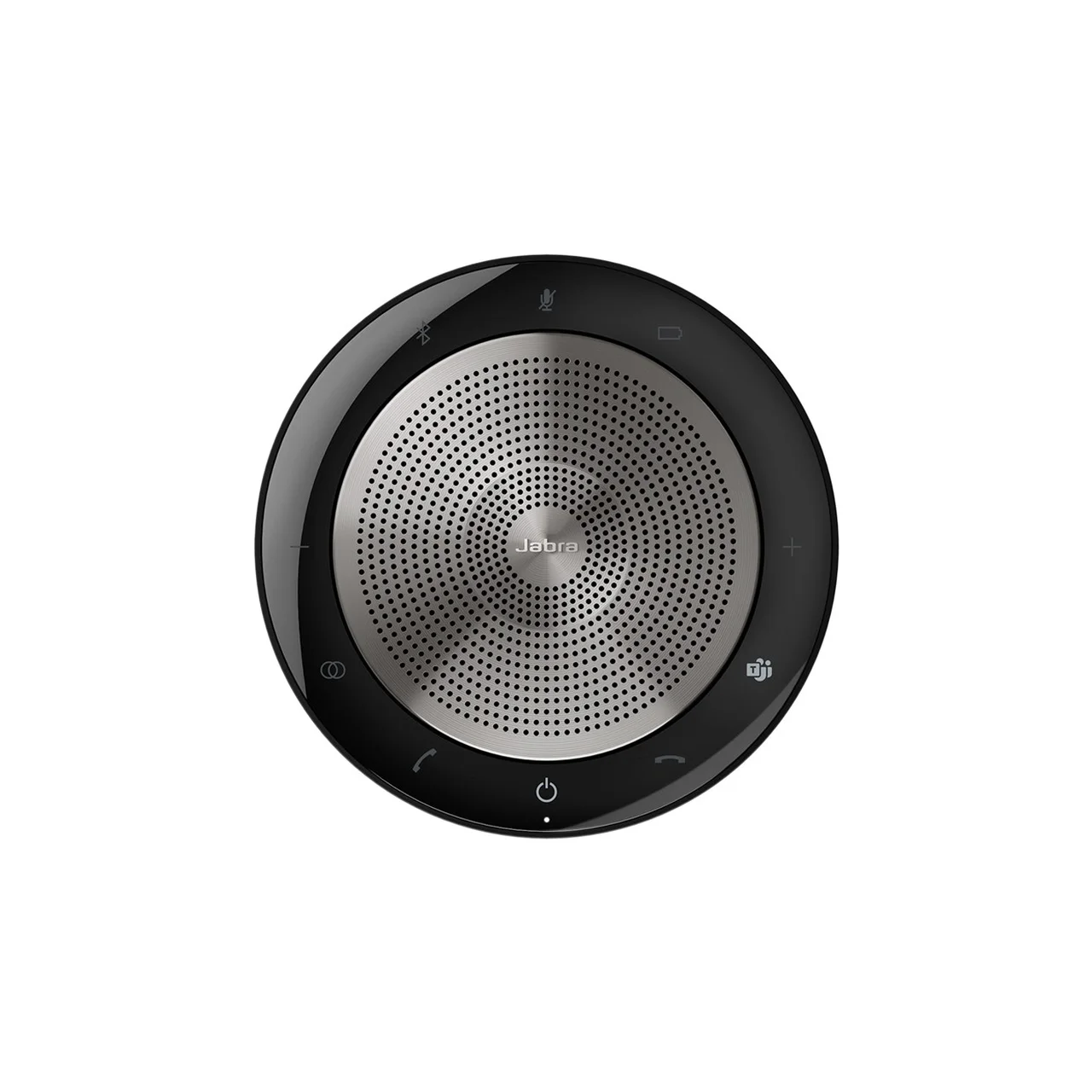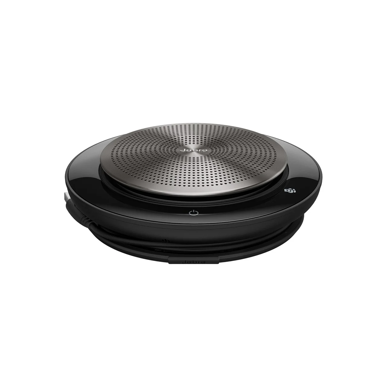 Kaasaskantav Jabra USB/Bluetooth konverentsitelefon hõbedase ja musta disainiga, suundamata mikrofoniga ning kajasummutusega selgeks suhtluseks.
