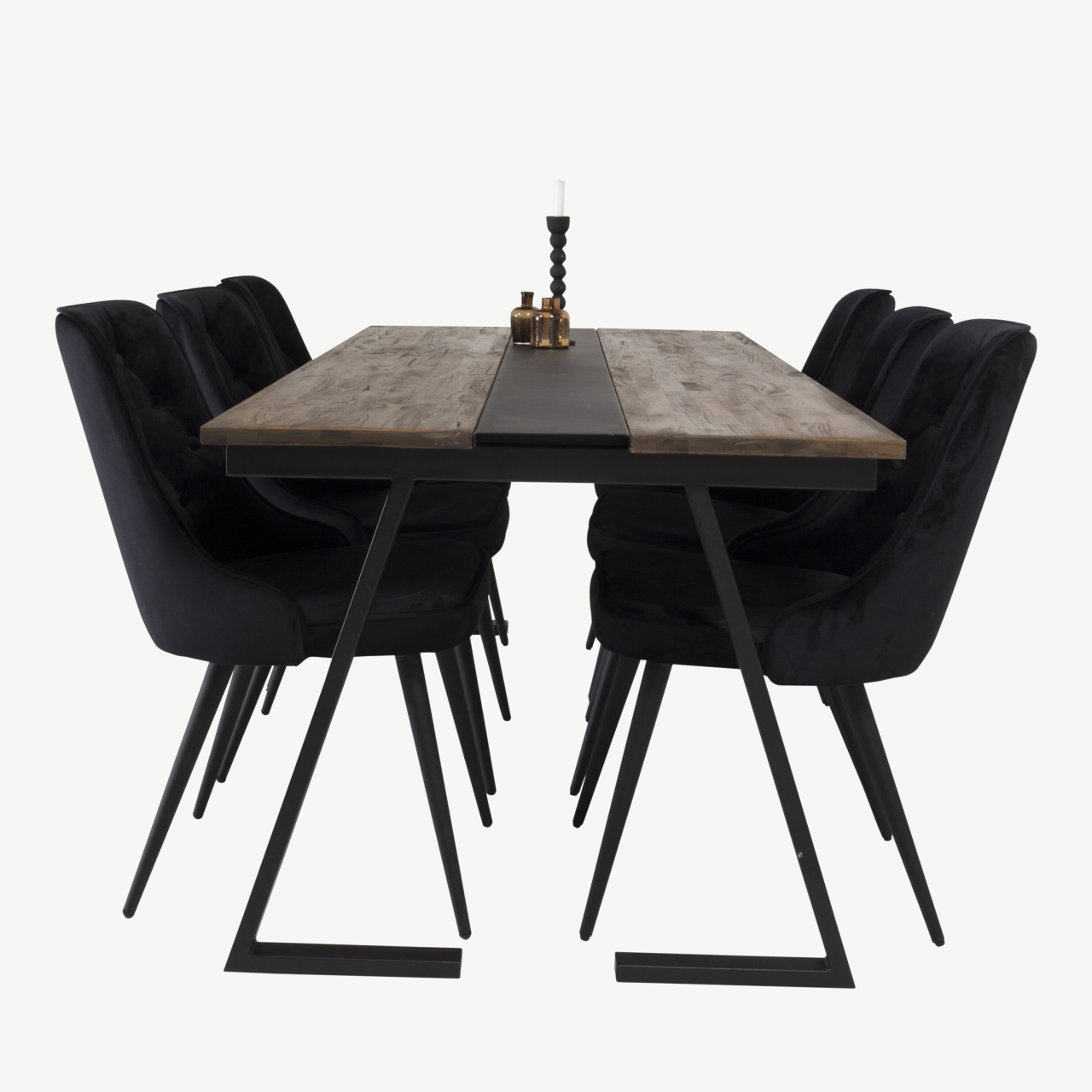 Tiigipuust söögilauakomplekt Jakarta ühendab põhjamaise minimalistliku disaini ning kvaliteetsed materjalid. Komplektis on massiivse tiigipuust lauaplaadiga söögilaud ja kuus Velvet Deluxe sarja musta velvetkangaga tooli. See kombinatsioon on suurepärane valik, kui soovid oma söögituppa nii hubasust kui modernset stiili – kompromisse tegemata vastupidavuse või mugavuse arvelt.