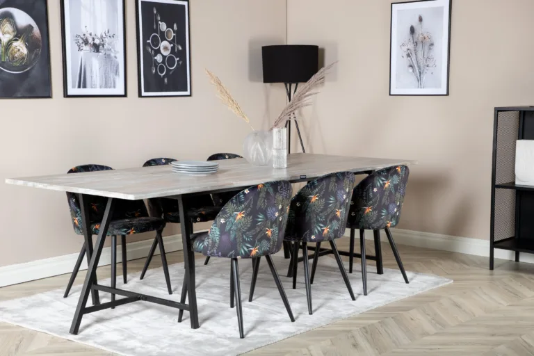 - Polsterdatud sametkattega toolid – Toolide istmed ja seljatoed on kaetud musta sametise polüestrikangaga, mida ilmestavad lillemustrid. Pehme polsterdus ja ergonoomiline vorm pakuvad tugevat ja mugavat istumist.