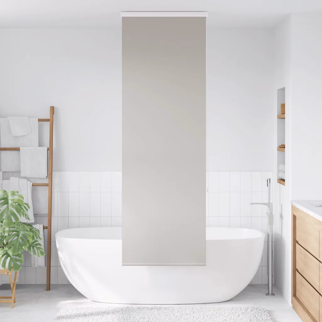 - Ruumisäästlik lahendus – ruloo saab täielikult kassetti üles rullida, mis sobib hästi väiksematesse vannitubadesse.