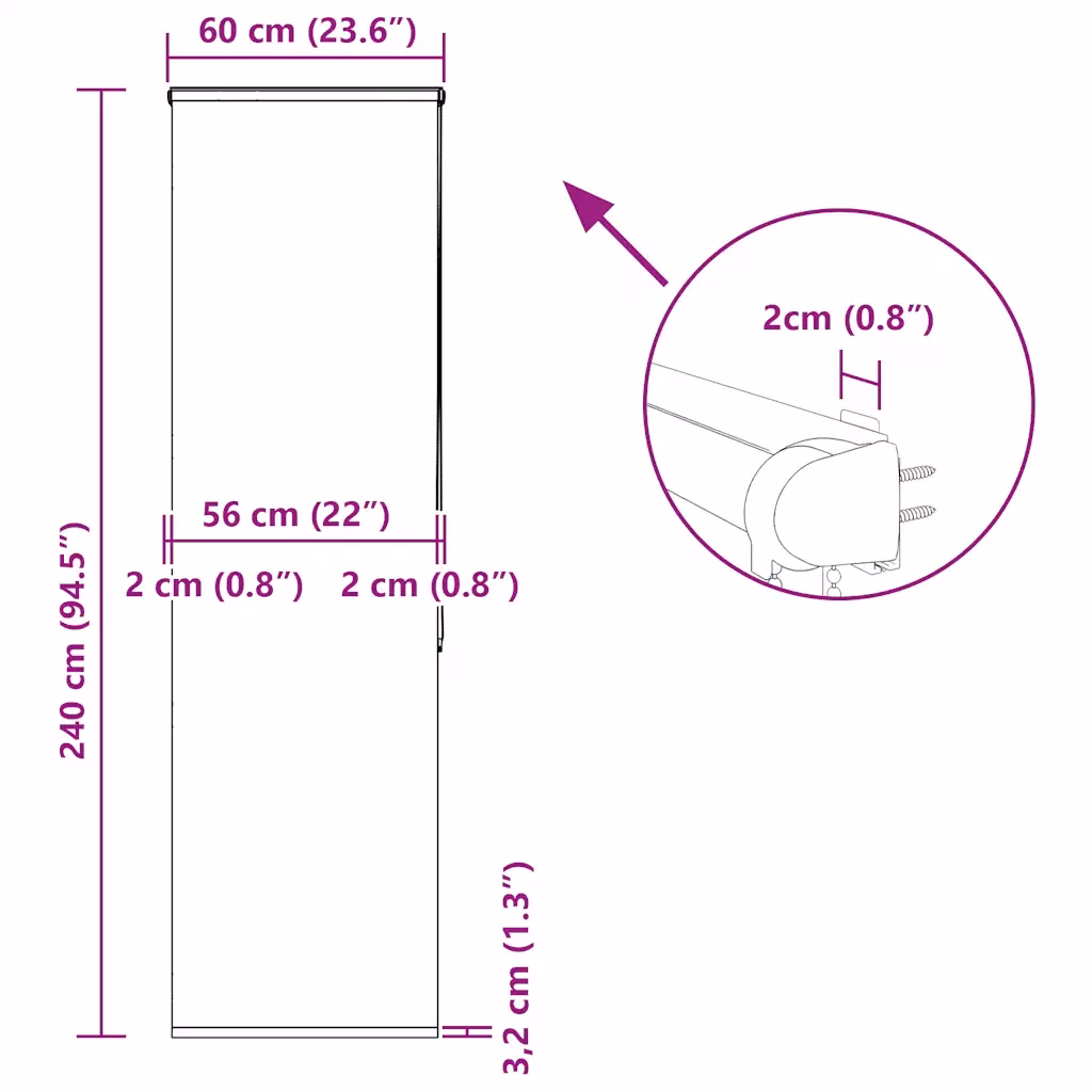 - Mõõdud 60 x 240 cm üldlaiuse ja kõrgusega, kanga laius on 56 cm, mis jätab ruumi kassetile ja kinnitusdetailidele.