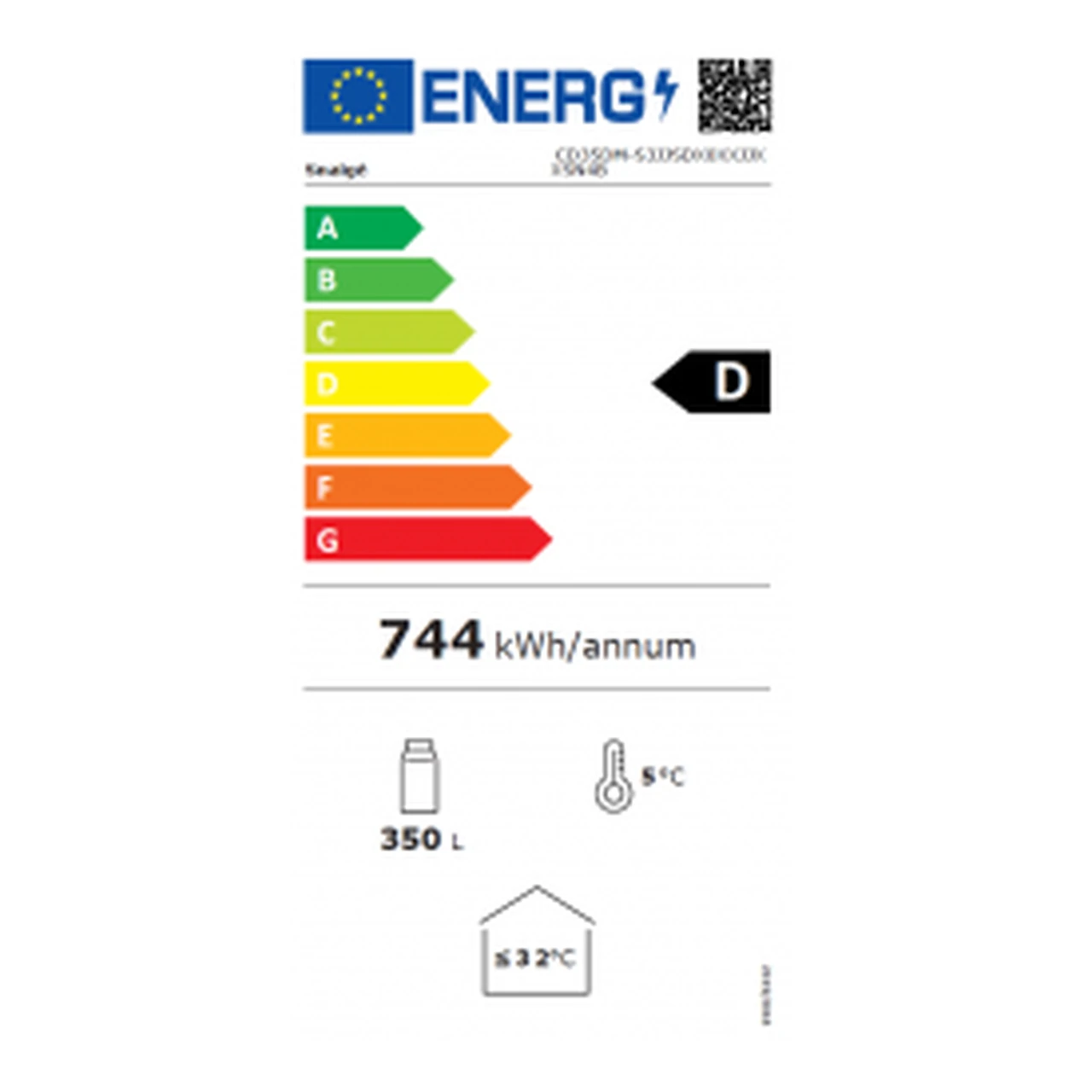 - Energiaklass D ning aastane energiakulu 744 kWh on tüüpilised selle suuruse ja klaasuksega vitriinkülmiku jaoks.