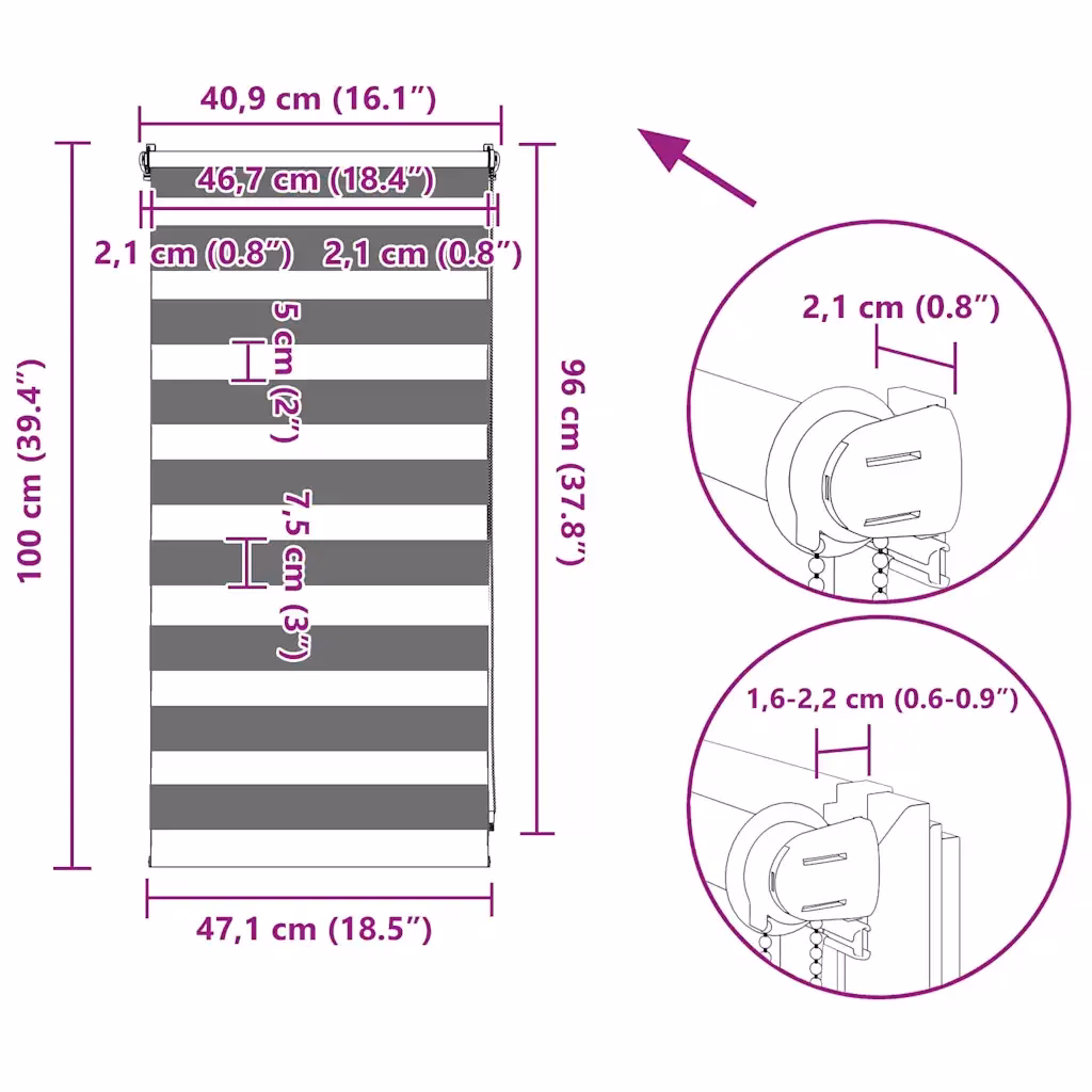 - Selge mõõdusüsteem ruloo suurus 40 x 100 cm viitab ülemise siini laiusele, kusjuures kangas on umbes 3 cm kitsam ning sobib paigaldamiseks aknaava või raami mõõte arvestades.