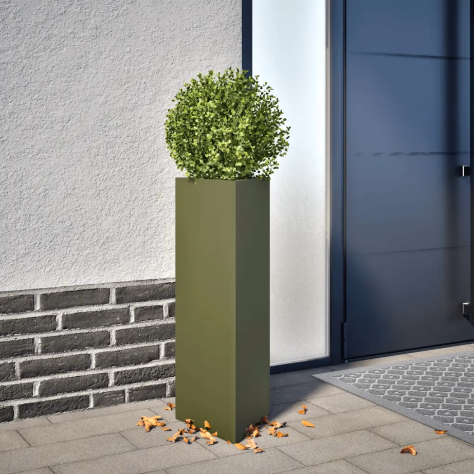 • 1 aia taimekast põhjaga, oliiviroheline teras, mõõtmed 30 x 26 x 75 cm (pikkus x laius x kõrgus)