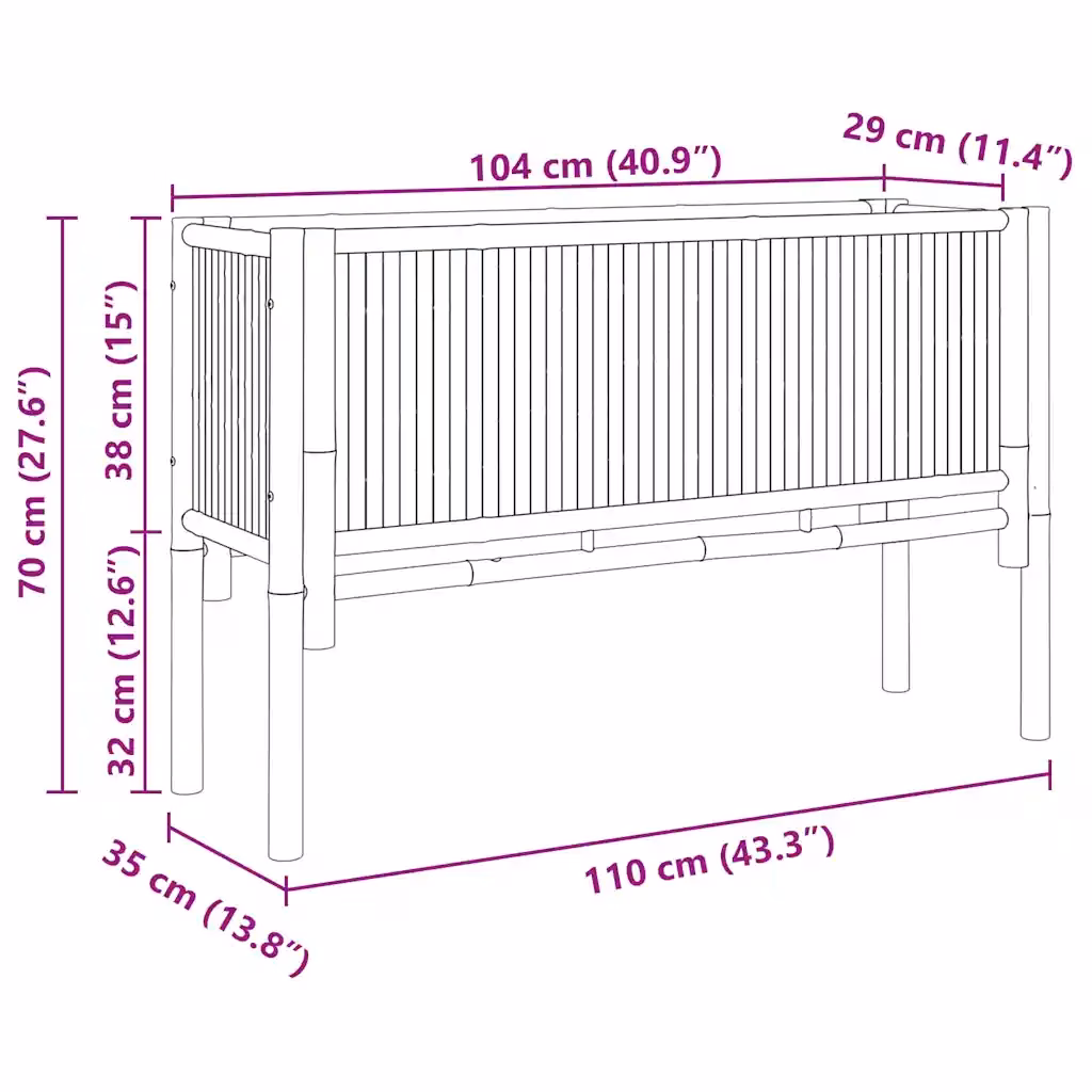 See bambusest kõrge istutuspeenar loob taimedele tõstetud kasvupinna, mis aitab hoida aia ja terrassi korrastatuna ning rõhutab istutuste ilu. Pruun naturaalne bambus sulandub kergesti erinevatesse aiakujundustesse, pakkudes samal ajal tugevat ja stabiilset raami põõsastele, lilledele või noortele puudele. Tänu kompaktsetele mõõtudele 110 x 35 x 70 cm sobib peenar hästi ka väiksematele välialadele, näiteks rõdule või seina äärde.