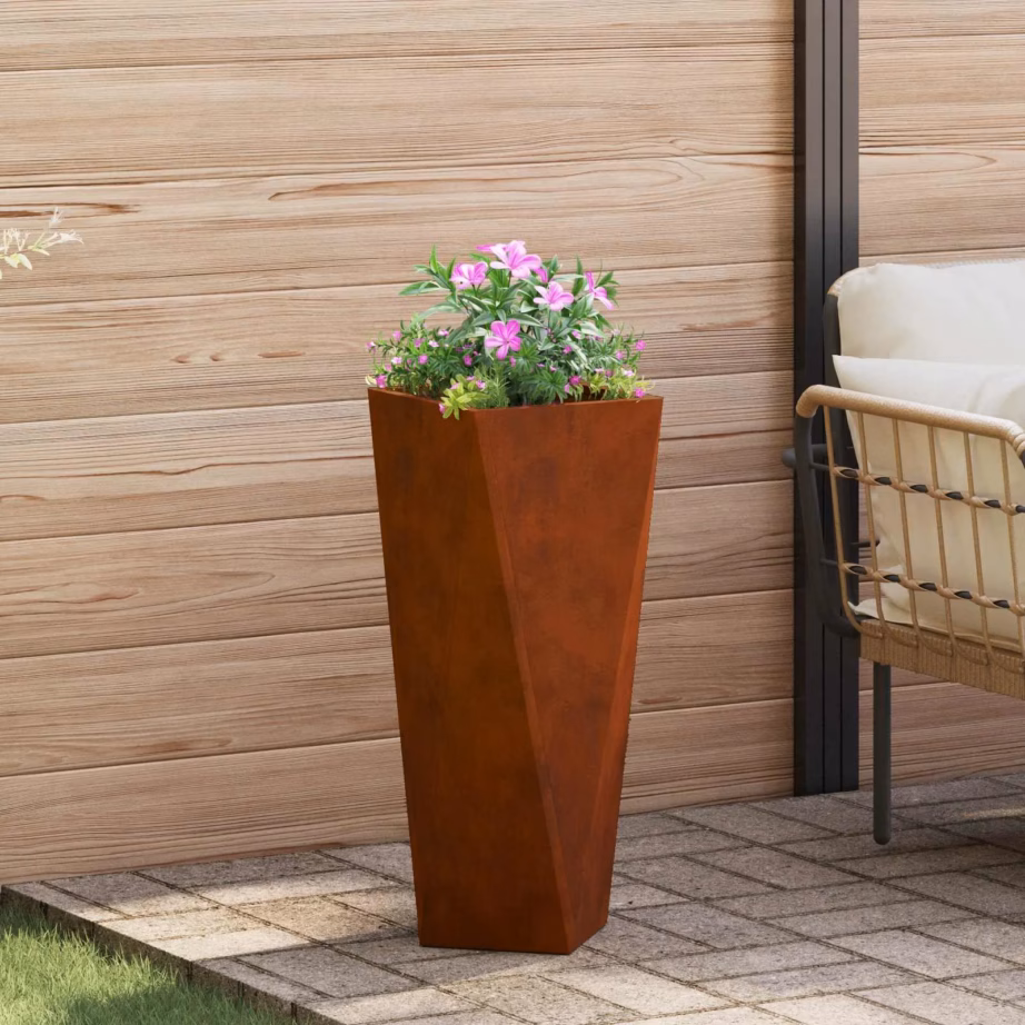 See kõrge terasest taimekast on praktiline lahendus, kui soovid terrassile, rõdule või aeda lisada vertikaalset rohelust ilma palju põrandapinda kulutamata. Roostevärvi viimistlus ja modernne, kergelt kitsenev kuju loovad pilkupüüdva aktsendi, mis sobitub nii kaasaegse kui ka looduslähedase väliruumi kujundusega. Tänu vastupidavale konstruktsioonile sobib istutuskast kasutamiseks aastaringselt välitingimustes.