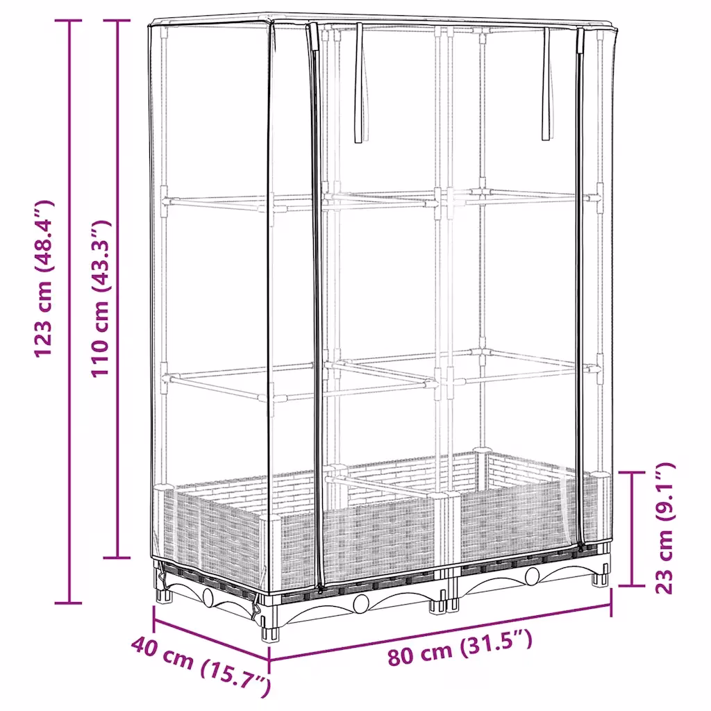See kasvuhoonekattega kõrgendatud taimekast pakub kompaktset ja kaitstud kasvuala köögiviljadele, maitsetaimedele ja lilledele. Musta värvi PP-kast rotangi välimusega, roheline PE-võrk ja rauast toruraam loovad stabiilse konstruktsiooni, mis sobib hästi nii aeda, siseõuele kui ka rõdule. Tänu vettpidavale kasvuhoonekattele on taimed paremini kaitstud tuule, vihma, temperatuuri kõikumiste ja kahjurite eest.