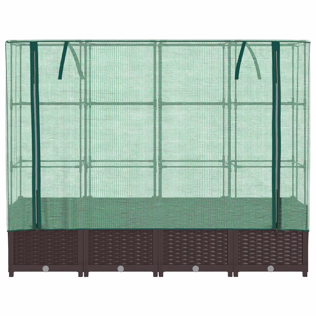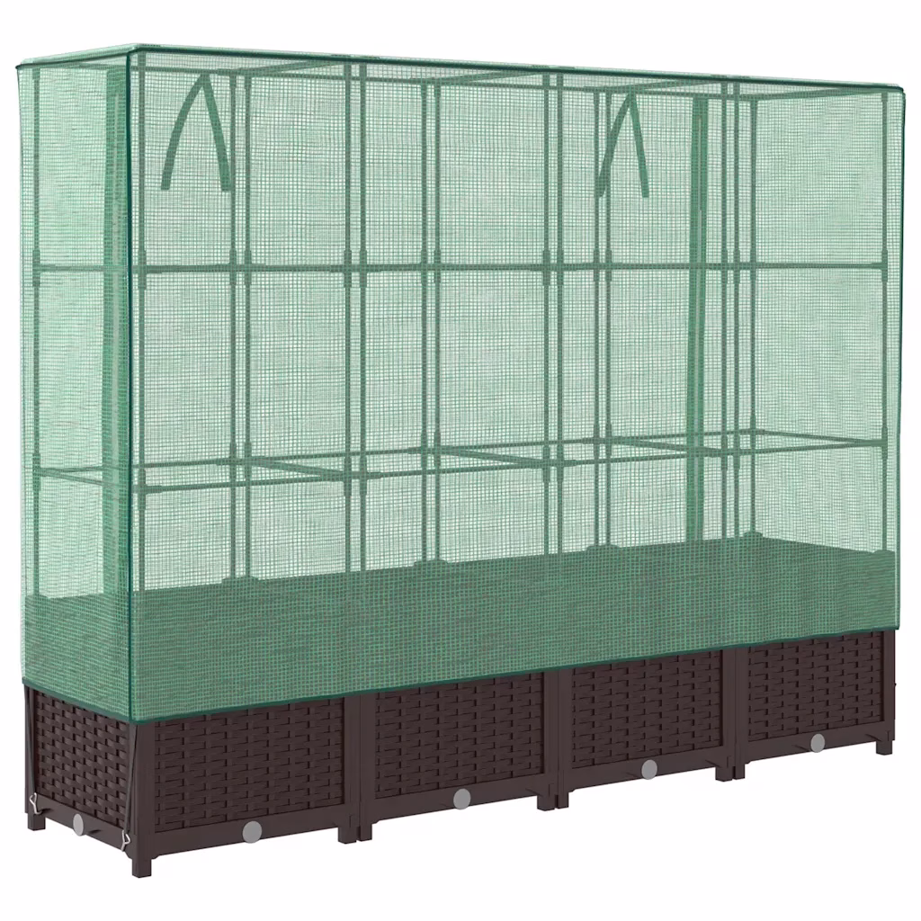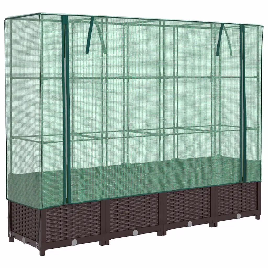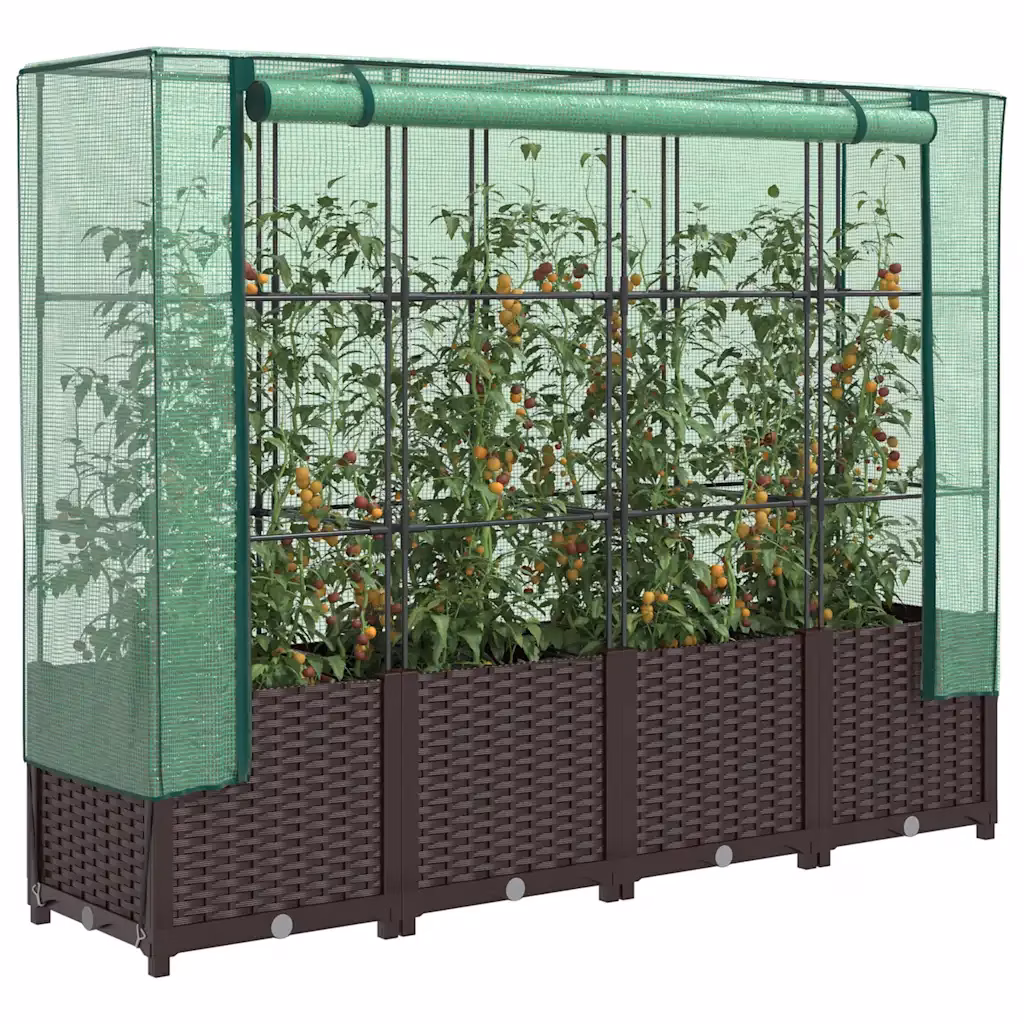 See kasvuhoonekattega kõrgendatud taimekast pakub rohkelt kasvupinda köögiviljadele, maitsetaimedele ja lilledele, võttes minimaalselt ruumi rõdul, aias või siseõues. Vettpidav kate ja tugev raam loovad taimedele kaitstud mikrokliima, mis aitab pikendada kasvuaega ja vähendada ilmastiku ning kahjurite mõju. Pruun rotangi välimusega PP-plastist viimistlus sobitub kergesti erinevate väliruumide stiiliga.
