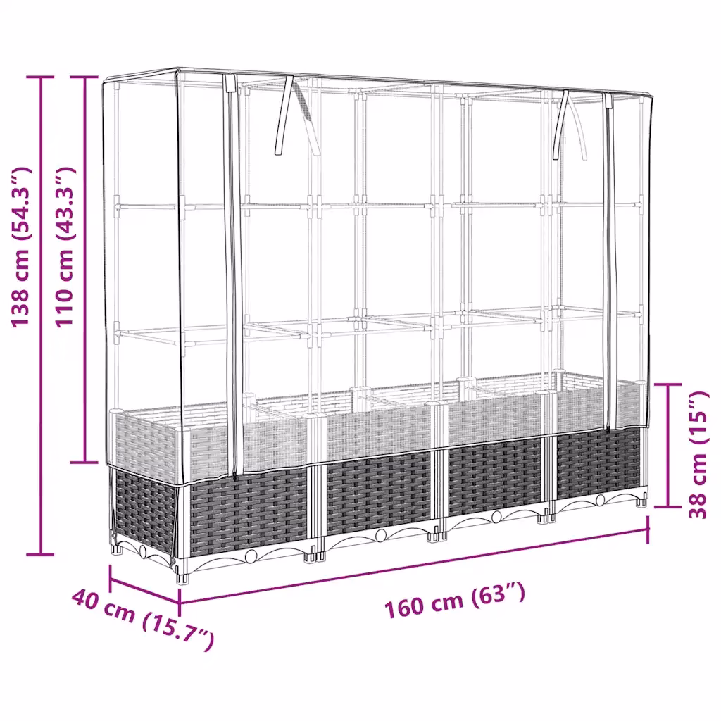 See 160 x 40 x 138 cm kõrgendatud taimekast on praktiline lahendus, kui soovid oma köögivilju, maitsetaimi või lilli kasvatada piiratud ruumis või muuta olemasolev aianurk tõhusamaks. Vettpidava kasvuhoonekattega konstruktsioon aitab kaitsta istutusi ilmastiku ja kahjurite eest, samas kui rotangi välimusega pruun viimistlus lisab välialale korrastatud ja ühtse ilme. Sobib hästi nii algajale kui kogenud hobiaednikule, kes otsib funktsionaalset ja hoolduskerget lahendust.