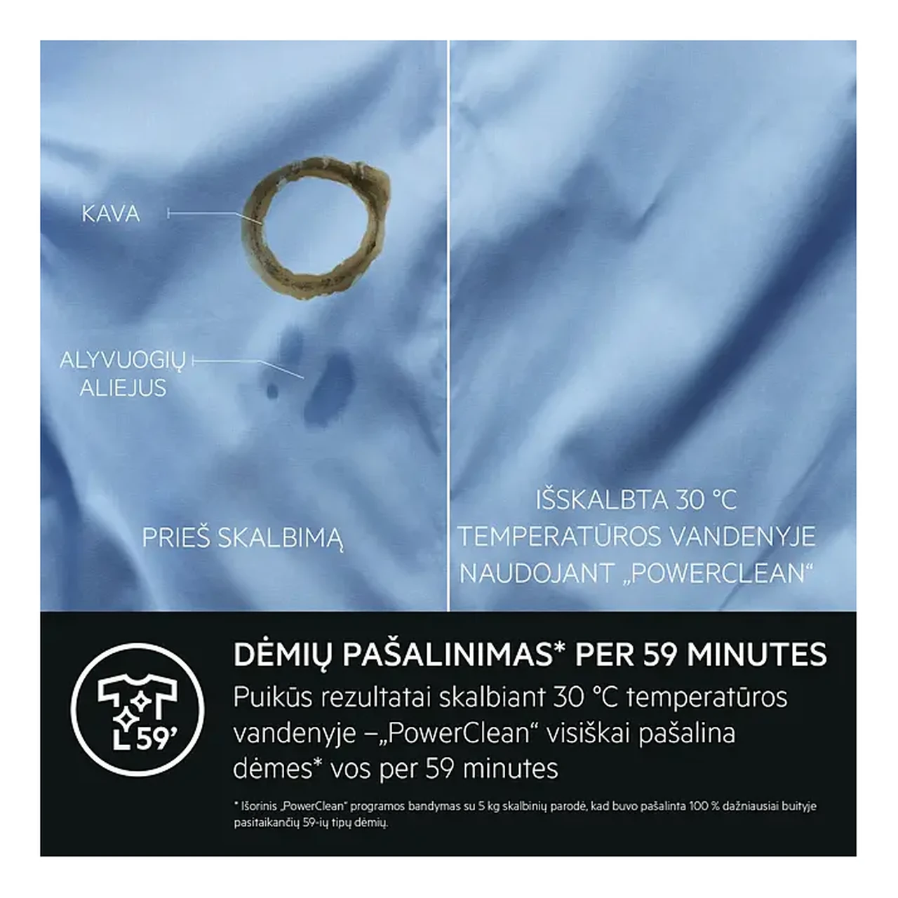 AEG 8000 seeria PowerCare tehnoloogia segab pesuvahendi veega enne trumlisse jõudmist, et jaotada see pesule ühtlaselt. Nii aitab masin saavutada häid tulemusi juba 30 °C juures ja lühemate programmidega, mis on riiete jaoks õrnemad. Tootja sisekatsete põhjal on PowerClean 59 min programm mõeldud levinud plekkide eemaldamiseks umbes tunniga 5 kg pesu korral madalal temperatuuril, mis sobib igapäevaseks pesuks.