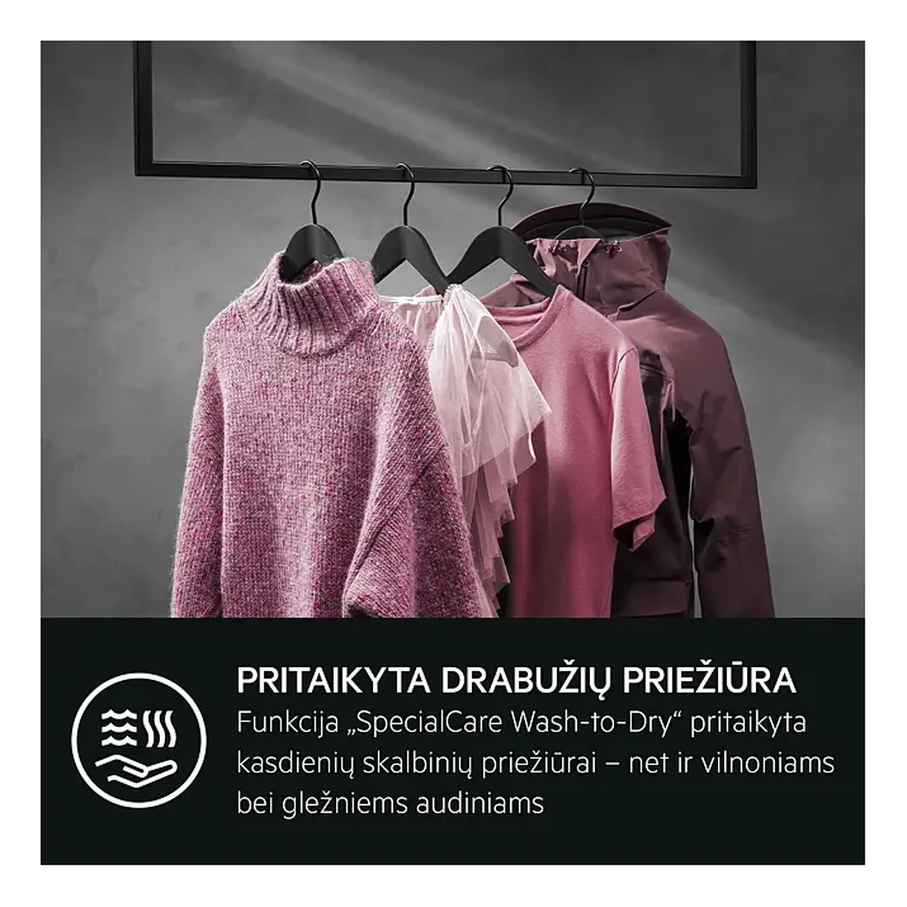 Programm SpecialCare Wash-to-Dry kohandab trumli liikumist, temperatuuri ja tsükli kestust vastavalt kangatüübile, et pesu oleks õrn, kuid tõhus. Woolmark Blue sertifikaadiga lahendus sobib villaste esemete ja õrnade kangaste pesemiseks ning kuivatamiseks, järgides hooldusjuhise nõudeid. Välisriiete puhul aitab programm taastada või säilitada nende veehülgavust, et jope või vihmamantel toimiks võimalikult hästi ka pärast mitmekordset pesu.
